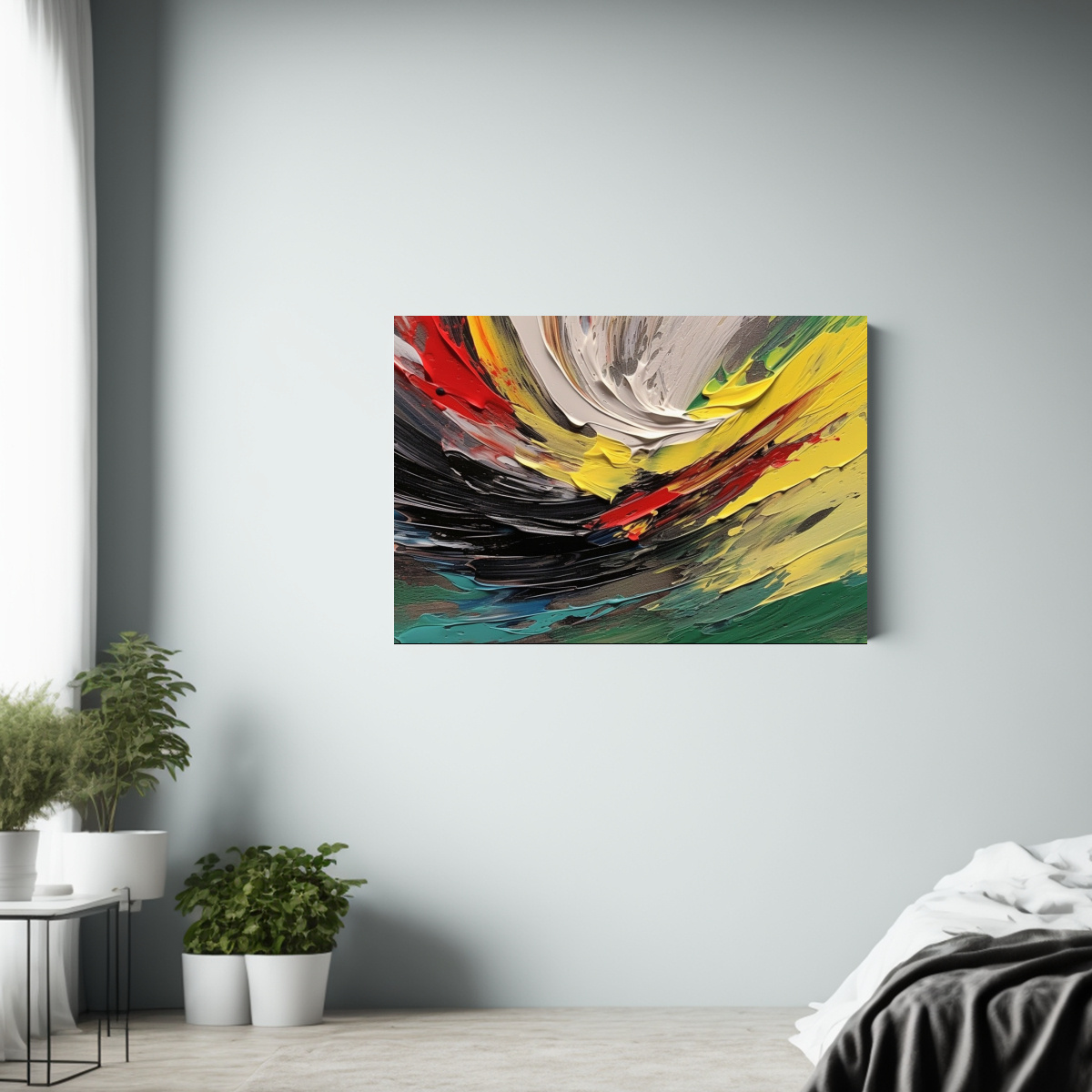 Renueva tu espacio con esta fina obra impresa en tela de alta calidad La combinación de colores vibrantes como el verde y amarillo, junto a tonos neutros como el gris y negro, aportará sofisticación a tu decoración Atrévete a darle un toque de elegancia con este cuadro único