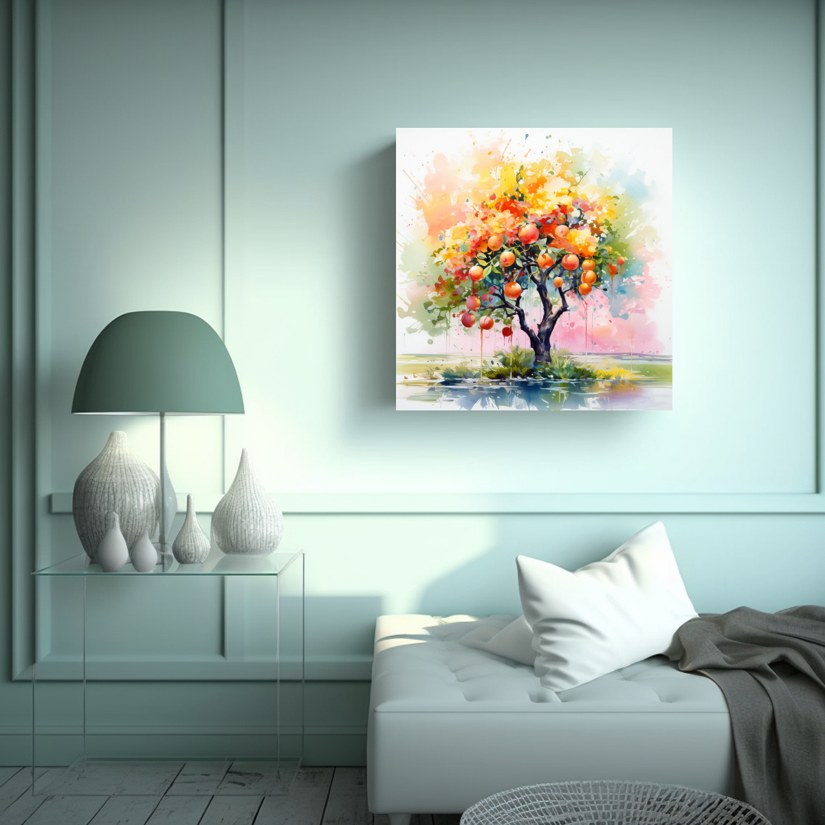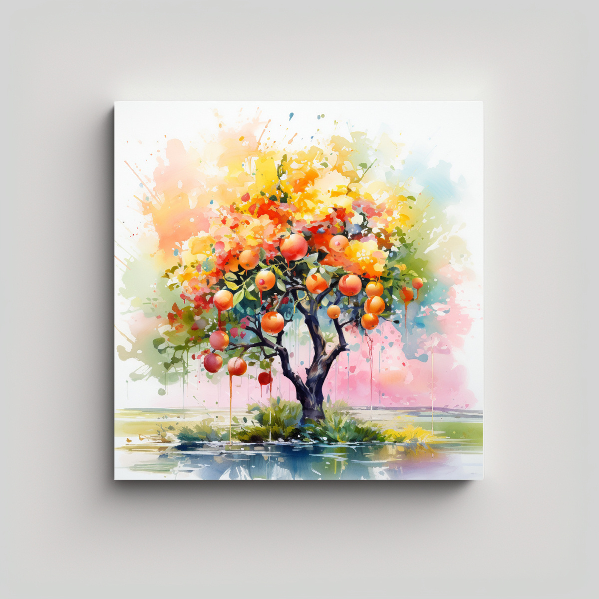 Este cuadro será el centro de atención en tu sala de estar Combínalo con muebles en tonos neutros como beige y grisaceo, y agrega detalles en dorado y plateado para un contraste elegante El cuadro también se verá genial en una habitación con una decoración de estilo vintage o bohemio ¡Deja volar tu imaginación y crea un ambiente lleno de estilo y personalidad con nuestro cuadro abstracto en acuarela con árbol naranja y colores pastel!