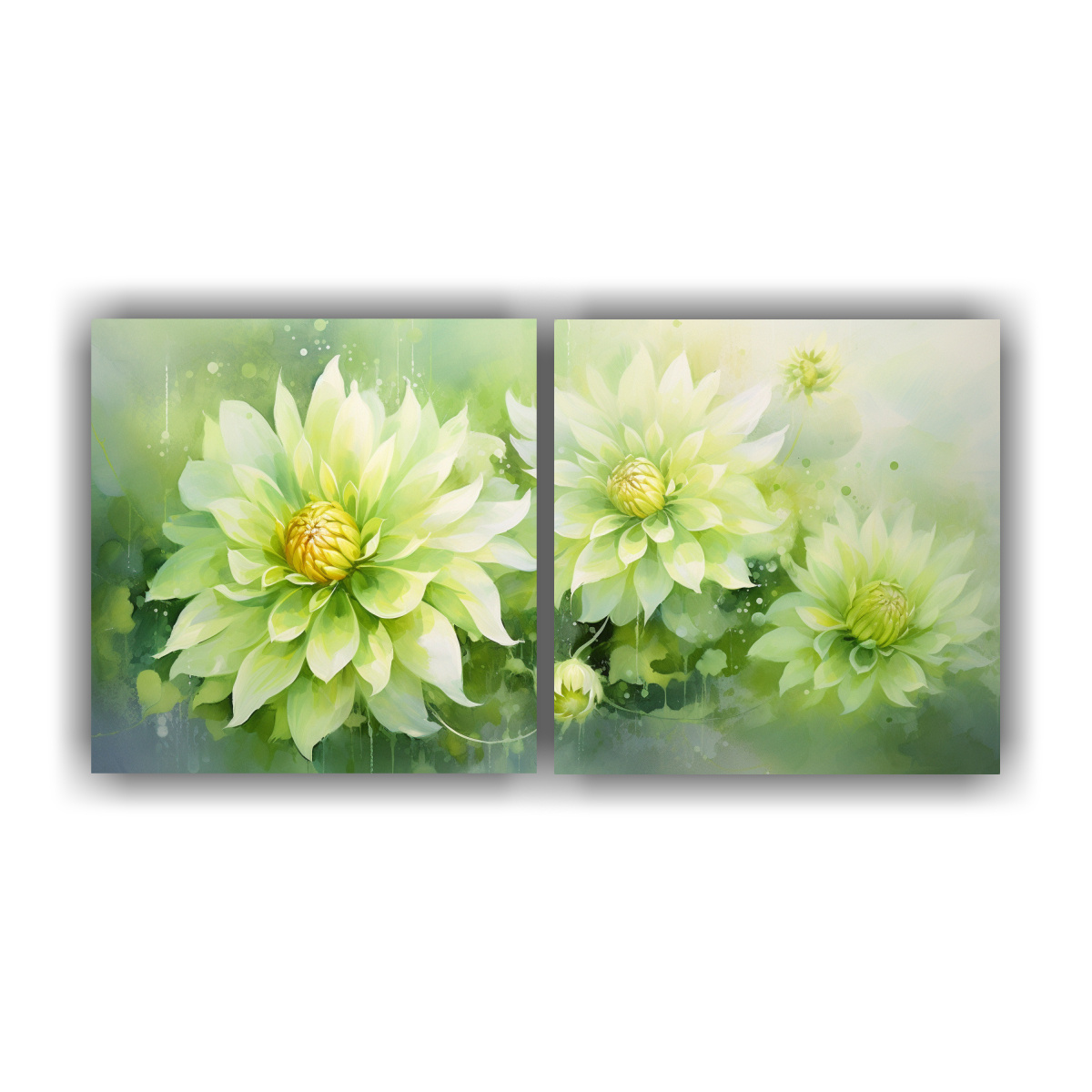 Pintura Abstracta En Acuarela De Flores Dahlias En Tonos Verdes