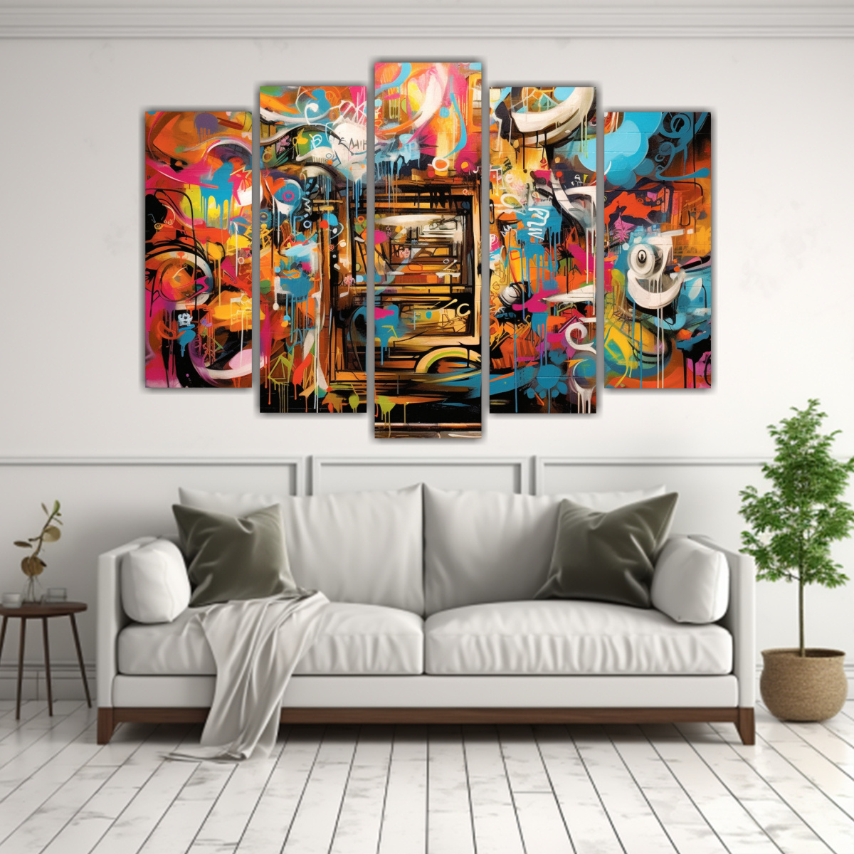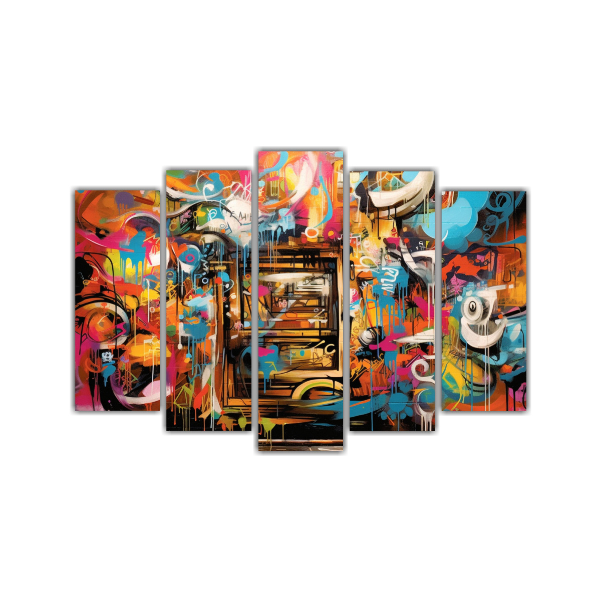 Este cuadro abstracto en cinco telas con estilo callejero graffiti luciría espectacular en la sala de estar sobre un sofá de color neutro Asegúrate de colocarlo en un lugar bien iluminado para resaltar sus colores y detalles