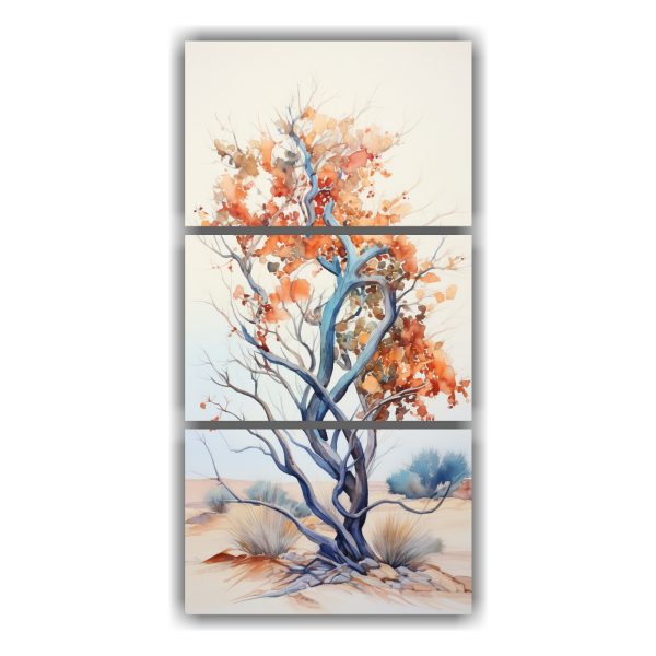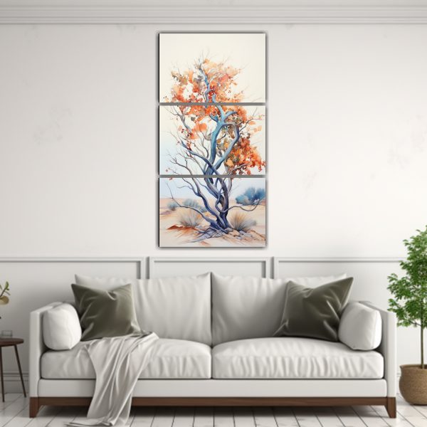 Renueva tu espacio con este cuadro abstracto en naranja y azul que representa un árbol ocotillo Los tonos azules, grises y turquesa se mezclan con el naranja y coral, creando una obra vibrante y moderna Atrévete a decorar tus paredes con este diseño exclusivo de DecoCuadros