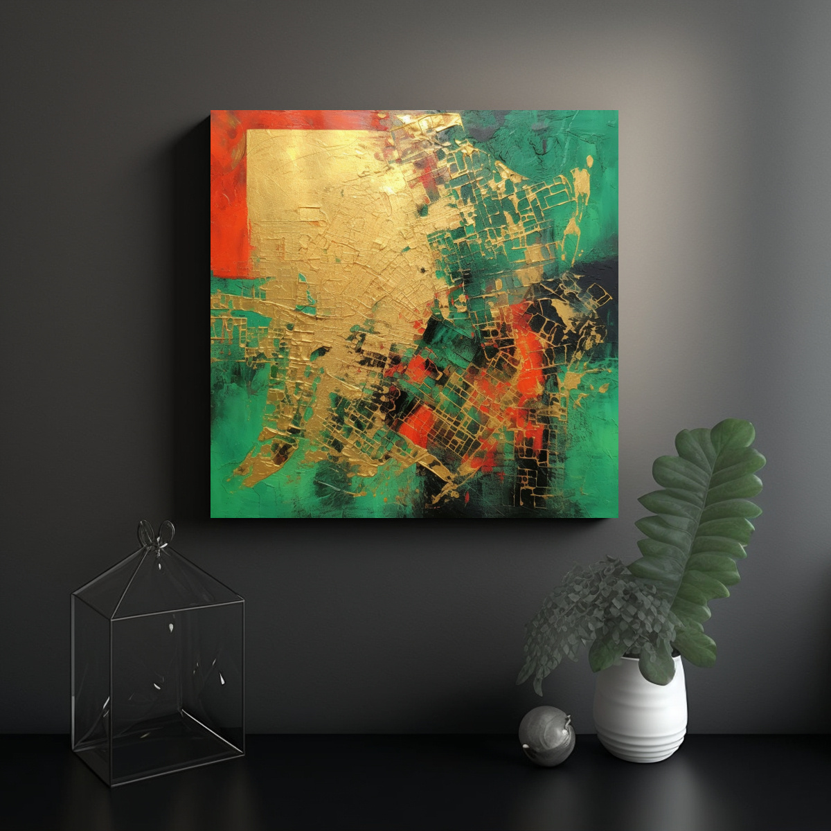 Coloca este cuadro abstracto en lienzo acrílico verde y rojo en tu sala de estar para crear un punto focal llamativo Combínalo con muebles en tonos neutros para resaltar su belleza y añadir un toque de color a la habitación ¡Renueva tu espacio con estilo y personalidad!