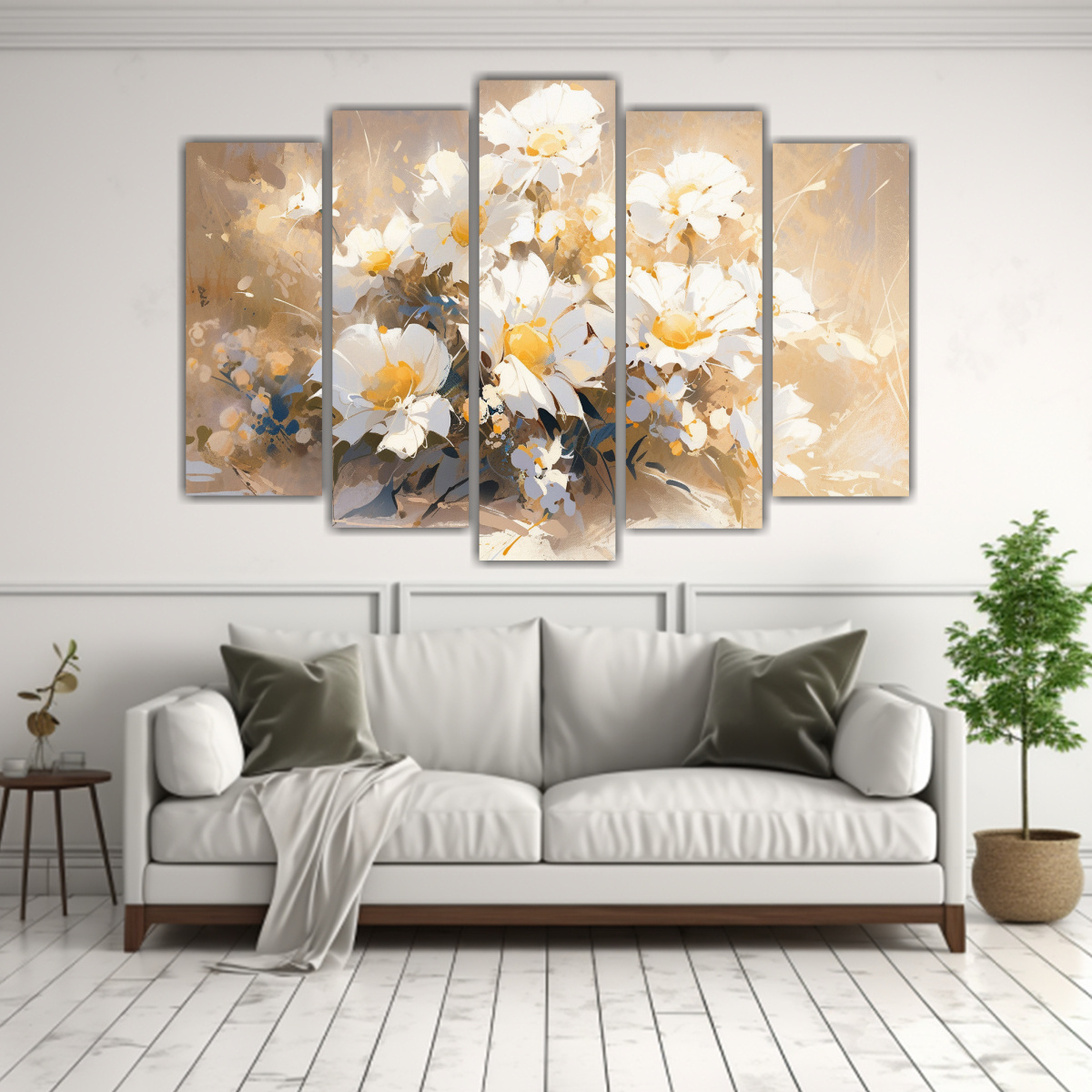 Este cuadro abstracto en amarillo y blanco con flores es ideal para colocar en el salón principal de tu hogar, sobre un sofá de color neutro para que resalte y aporte luminosidad al ambiente Combínalo con cojines en tonos cálidos y una alfombra de pelo corto para crear un espacio acogedor y elegante