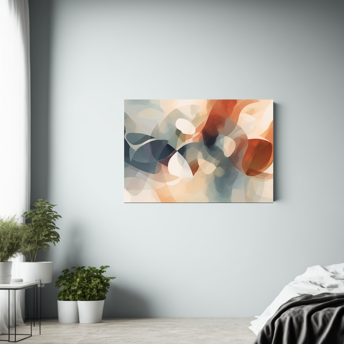 Este cuadro abstracto en tonos suaves es perfecto para destacar en una pared blanca o neutra, creando un punto focal elegante y moderno Combínalo con muebles en tonos neutros para un ambiente sofisticado y equilibrado