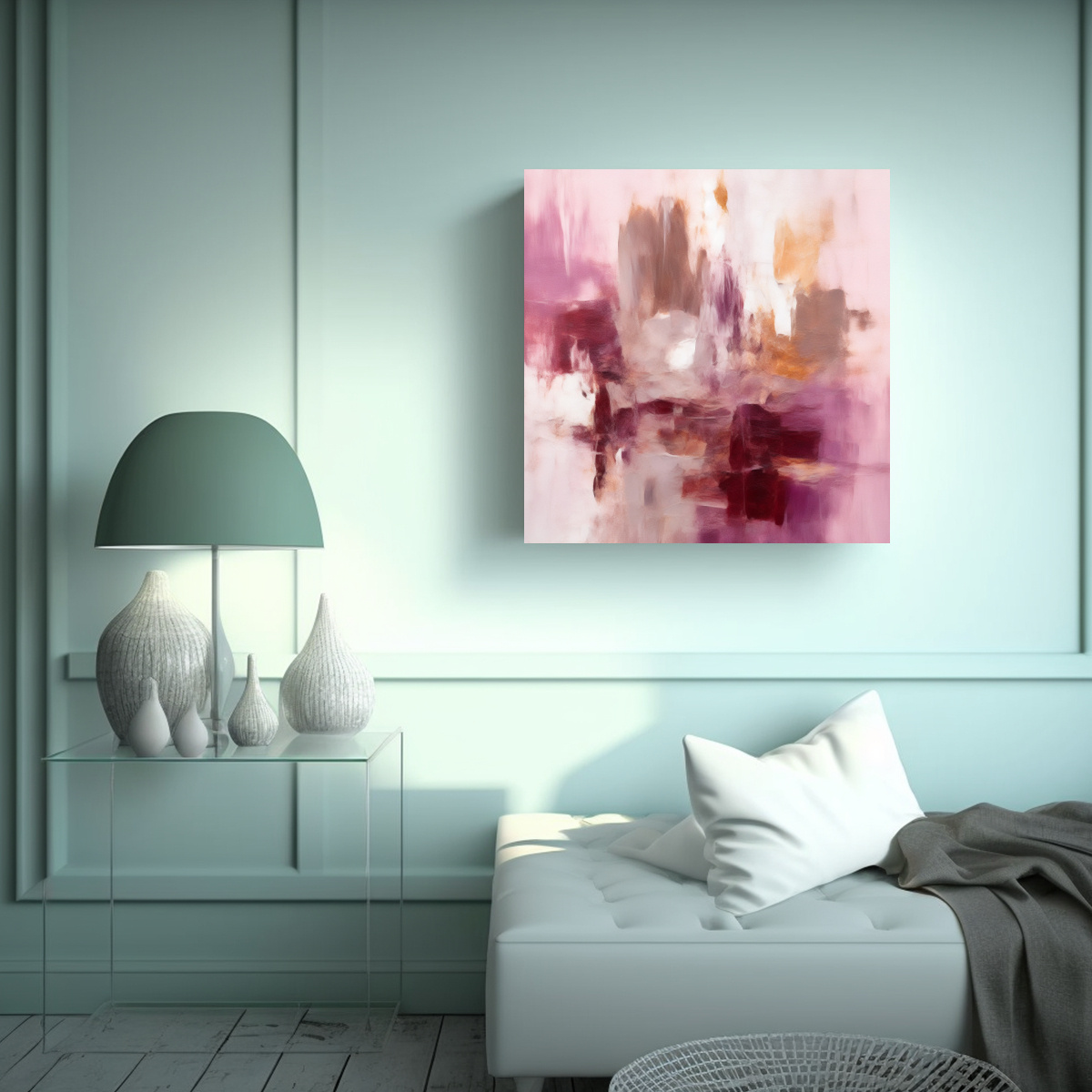 Este cuadro se vería perfecto en una sala de estar moderna, añadiendo un toque de elegancia y sofisticación Puedes combinarlo con muebles en tonos neutros como el blanco, gris o beige, y complementarlo con cojines en colores lila o carmesí para crear una atmósfera acogedora y contemporánea