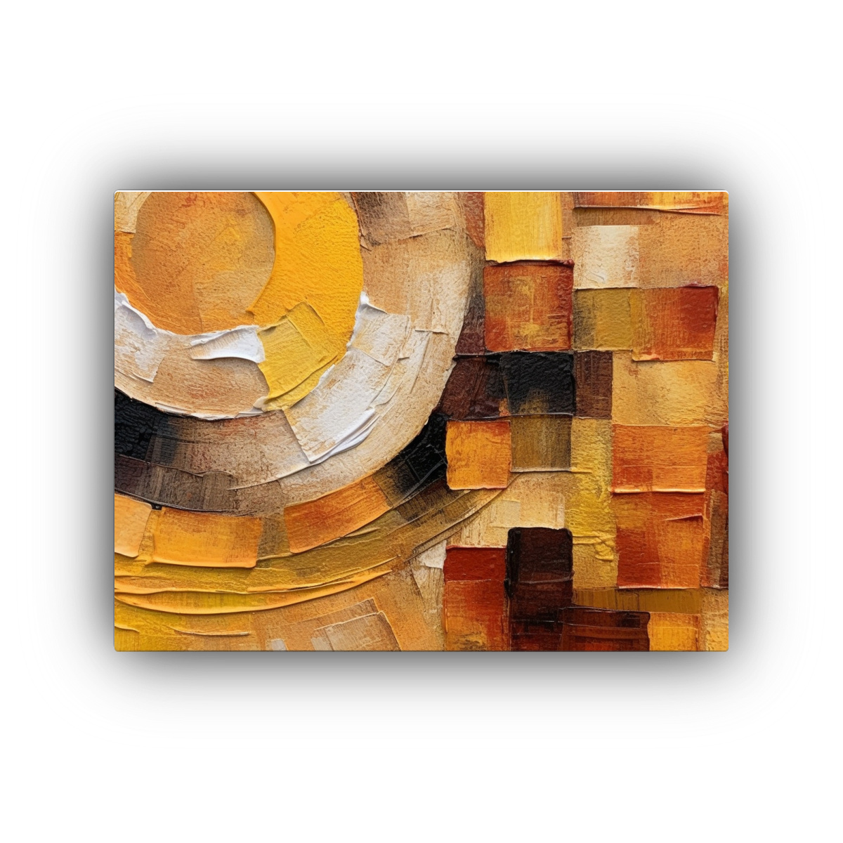 Este cuadro abstracto con colores intensos como Coral, Azul Marino grisáceo y Dorado, es perfecto para colocar en el área de trabajo de tu oficina o estudio en casa Combínalo con muebles de tonos neutros y elementos decorativos en colores cálidos para resaltar su efecto visual y crear un ambiente creativo y estimulante