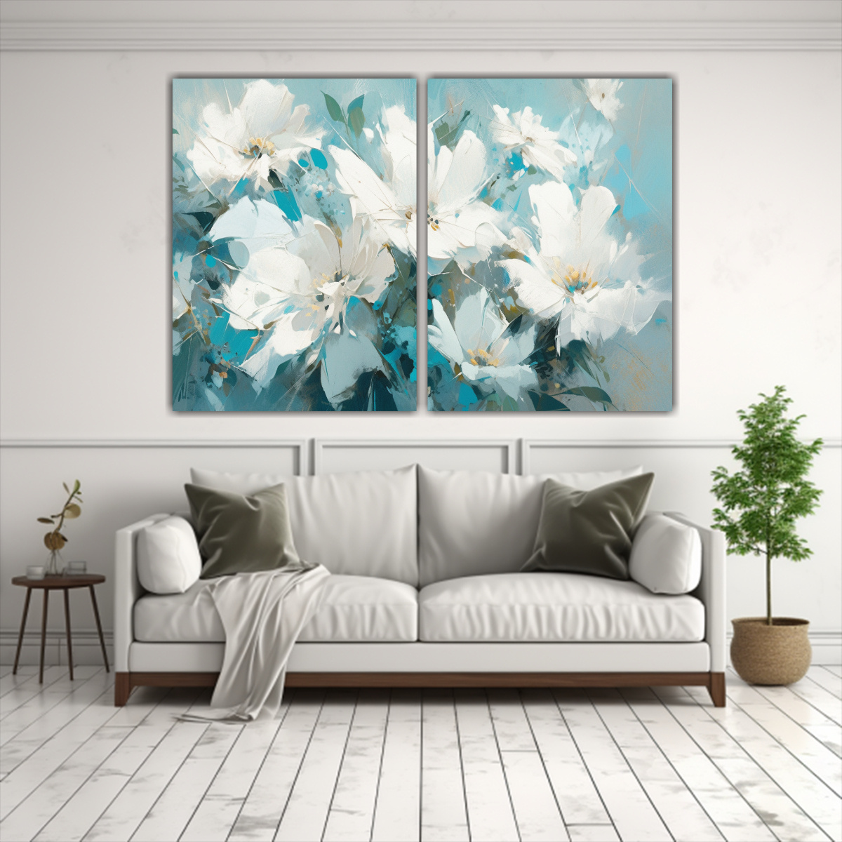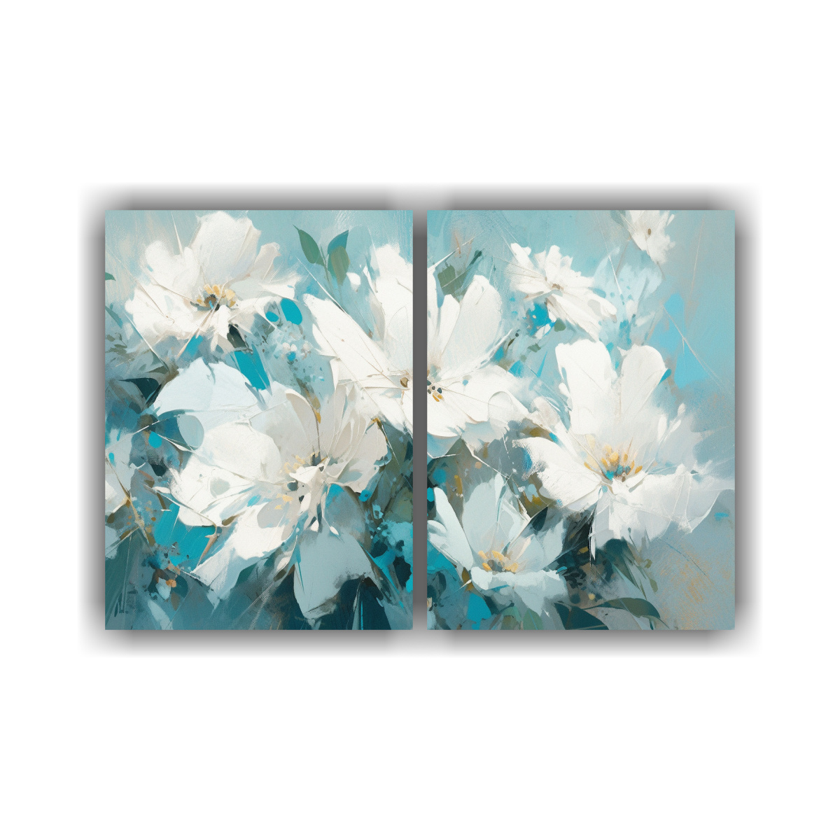 Renueva tu espacio con este set de 2 lienzos de abstracción profunda en colores blancos y turquesa, perfectos para darle vida a tus paredes Los tonos verde azulado, beige, gris y plateado crean una atmósfera única y elegante en tu hogar