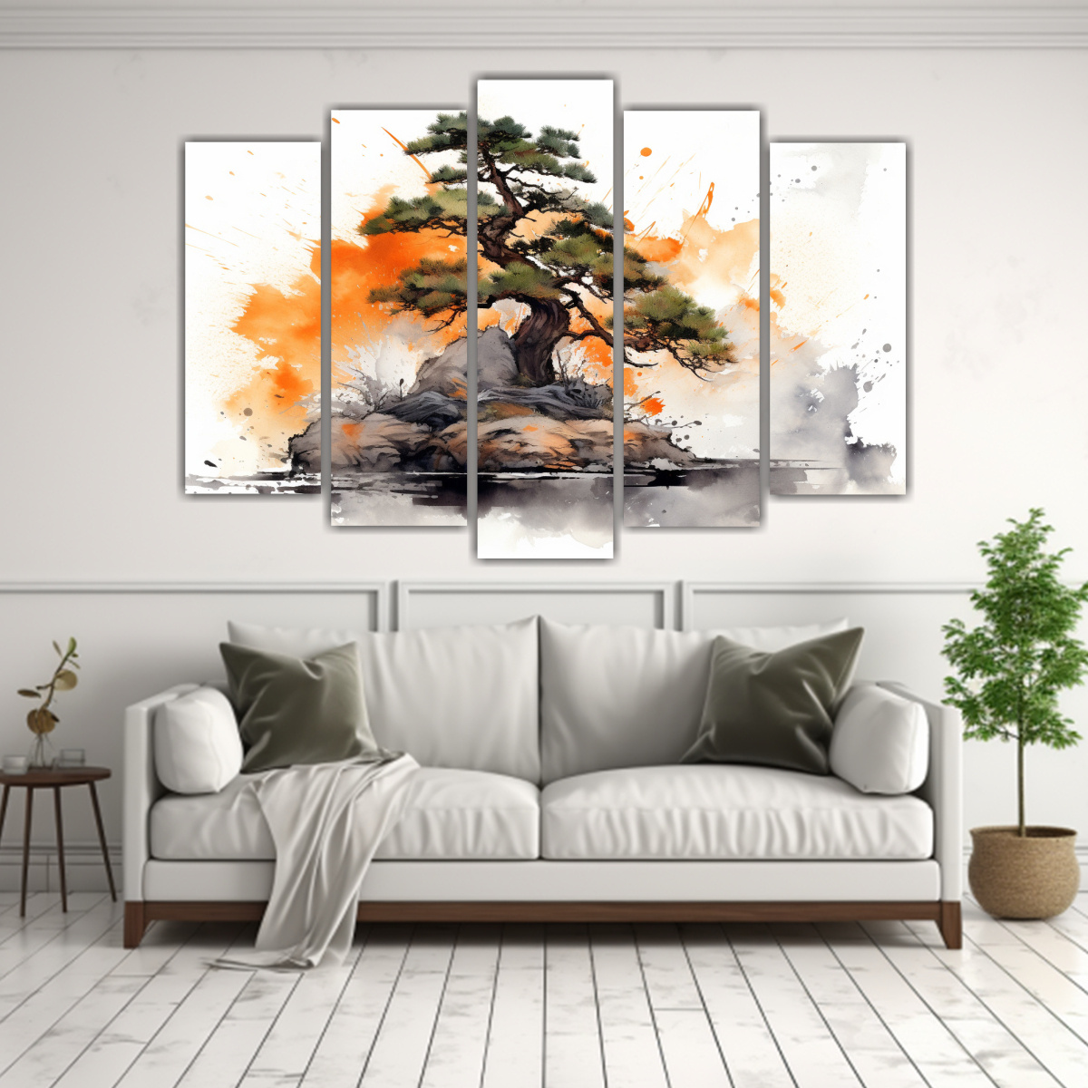 Este cuadro abstracto de árbol bonsái en naranja y negro es ideal para colocar en la sala de estar sobre un sofá de tonos neutros, creando un contraste elegante y moderno También puede ser el centro de atención en un espacio de trabajo para inspirar creatividad