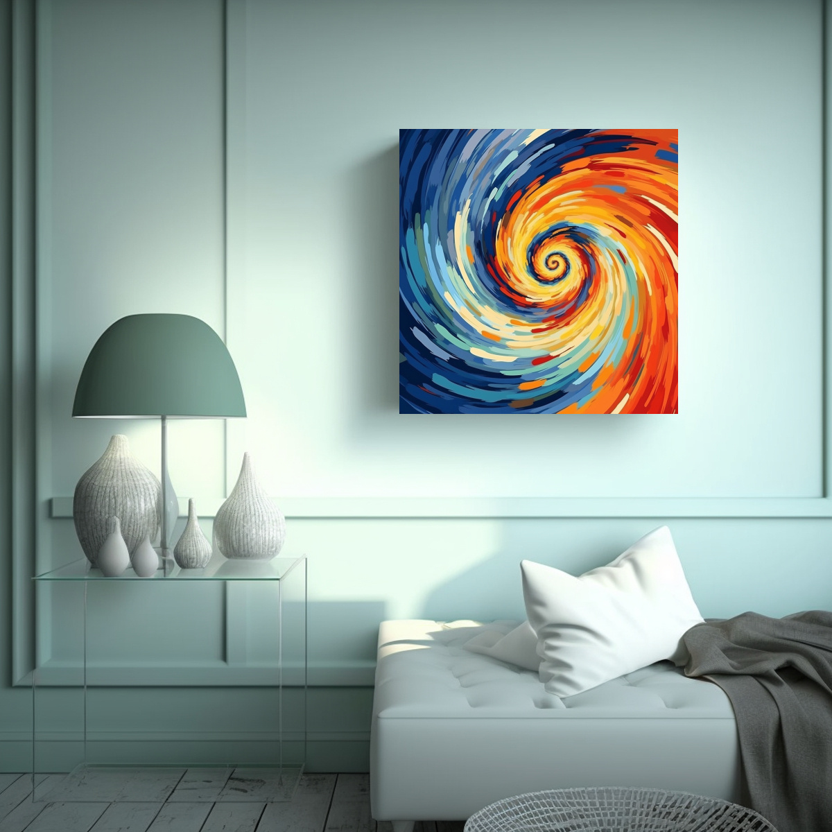 Este cuadro ‘Pintura abstracta en lienzo espiral duradera’ con colores Coral, Gris, Azul Marino grisaceo, Carmesi, Plateado, Amarillo Claro y Menta sería perfecto para decorar una sala de estar moderna Colócalo sobre un sofá gris claro para crear un contraste elegante Agrega cojines en tonos plateados y amarillos para complementar el cuadro ¡Transforma tu espacio con este diseño exclusivo de DecoCuadros!