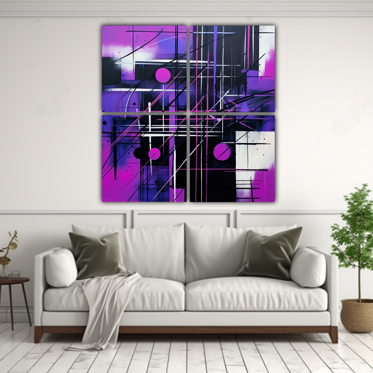 Pintura Abstracta En Lienzo Sublimado Minimalista Morado Neón Y Negro Con Líneas Rectas.