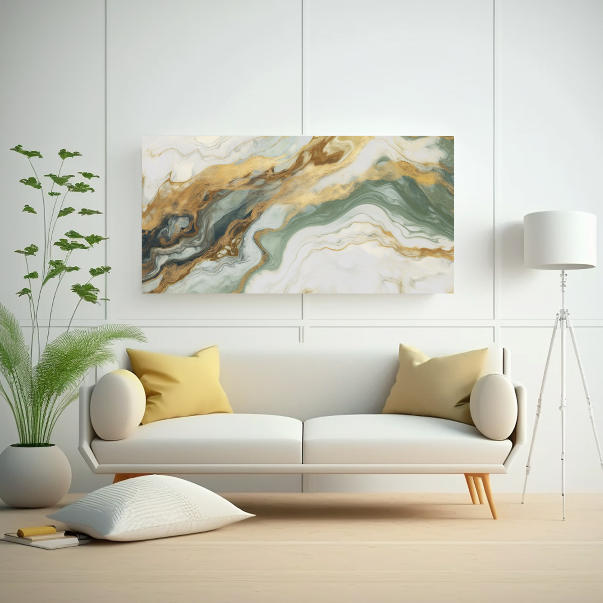 Este cuadro de mármol beige, verde y dorado se vería magnífico en un ambiente de estilo moderno o contemporáneo Colócalo en la sala de estar sobre un sofá gris para crear un contraste elegante y sofisticado ¡Dale un toque de lujo a tu espacio con esta obra de arte exclusiva de DecoCuadros!