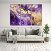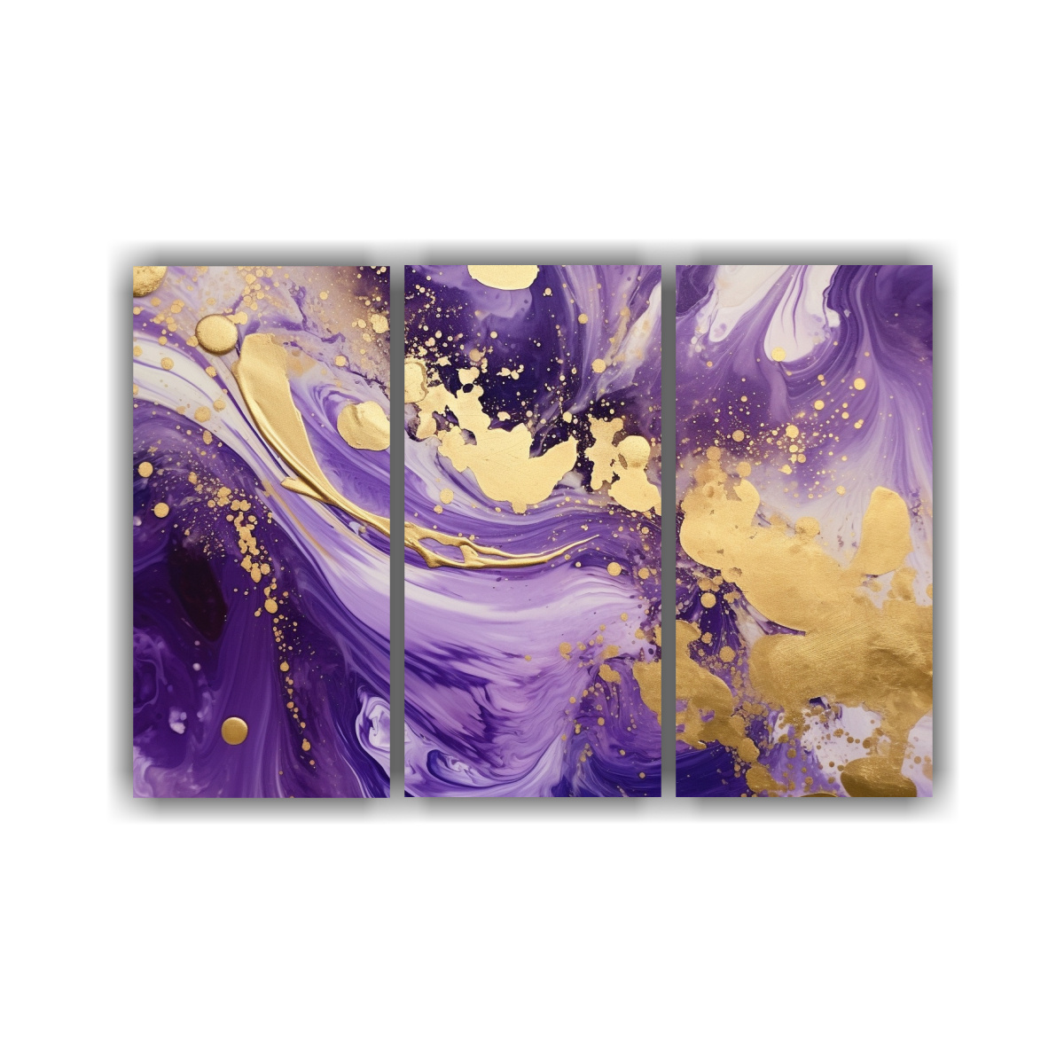 Este cuadro abstracto en tela púrpura y dorado con remolinos se vería espectacular en una pared de tonos neutros como blanco o gris claro Colócalo en el centro para que sea el punto focal de la habitación y combínalo con cojines y accesorios en tonos morados, dorados y plateados para crear un ambiente armonioso y chic