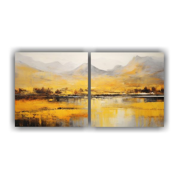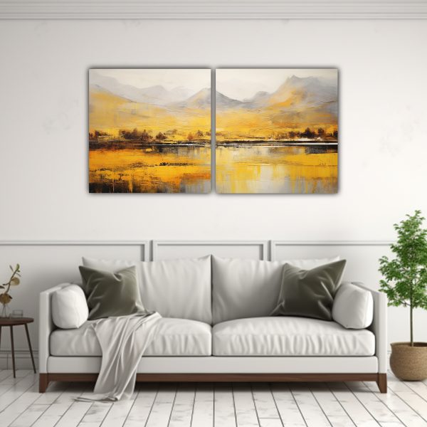 Pintura Abstracta En Tonos Amarillos De Montañas Junto Al Lago
