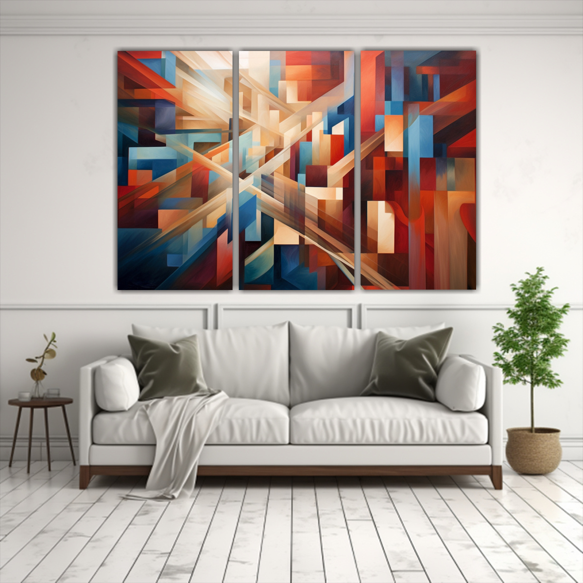 Este cuadro abstracto en tonos rojos y azules con marco marrón se vería perfecto en la sala de estar sobre un sofá gris claro para crear un contraste elegante Combínalo con cojines en tonos coral y plateado para darle armonía y sofisticación a tu espacio