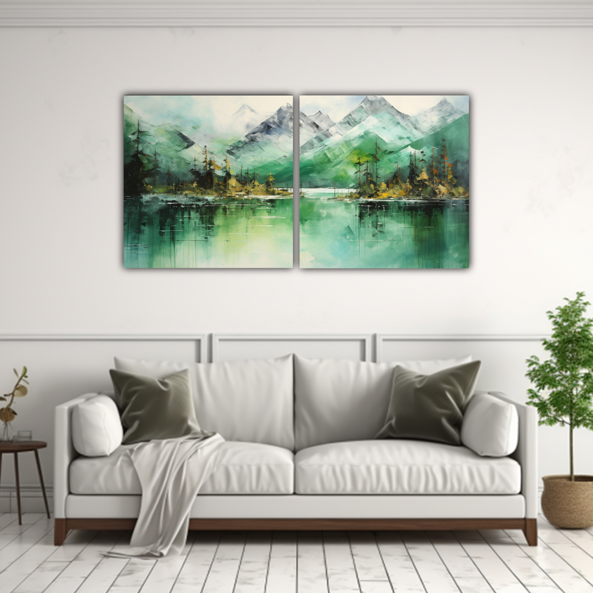 Este cuadro abstracto de montañas y lago en tonos verdes sería perfecto para decorar tu sala de estar sobre un sofá gris claro, resaltando la paleta de colores y creando un ambiente relajante y moderno ¡Combina arte y estilo en tu hogar!