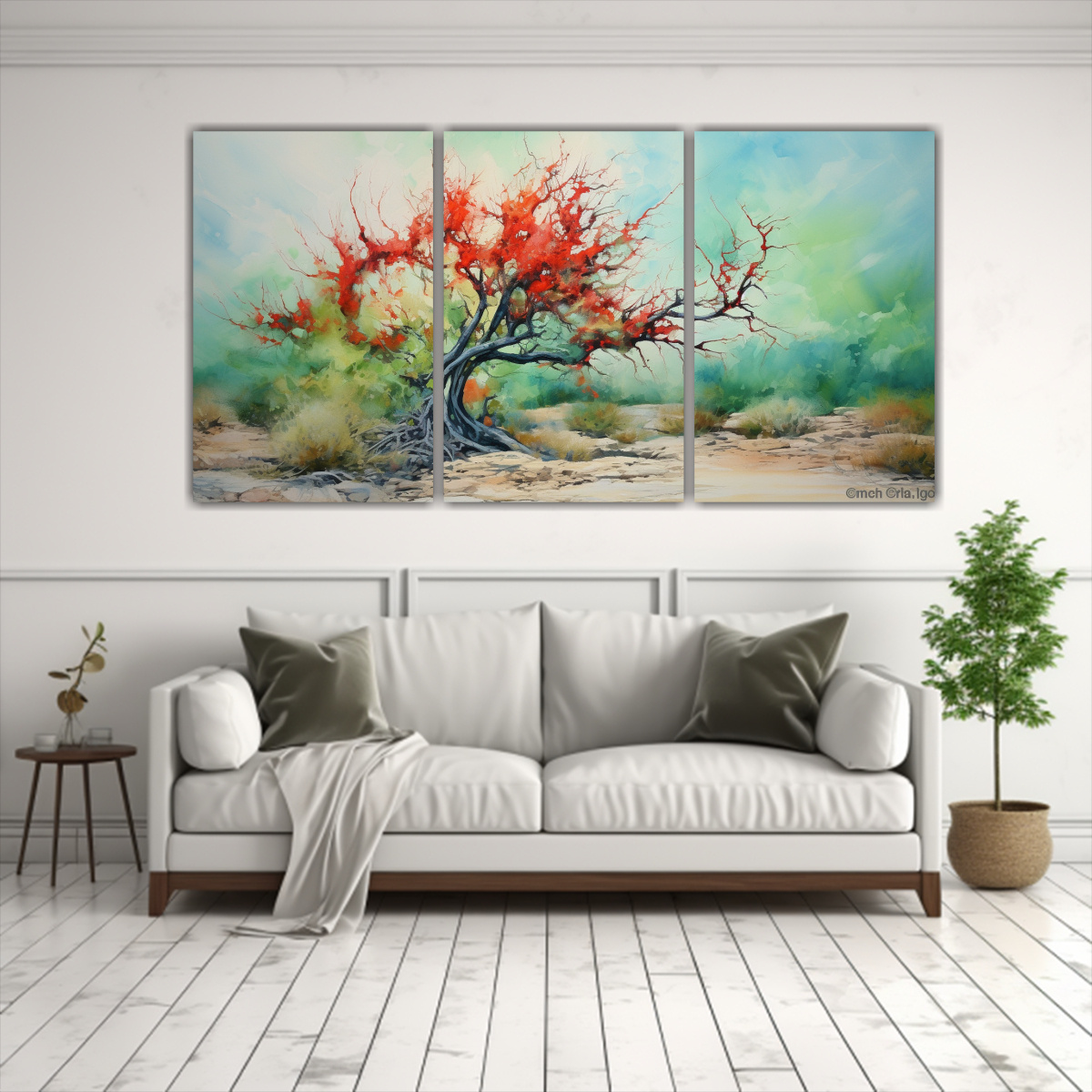 Pintura Abstracta En Verde Y Rojo Inspirada En El árbol De Ocotillo En Tres Bastidores