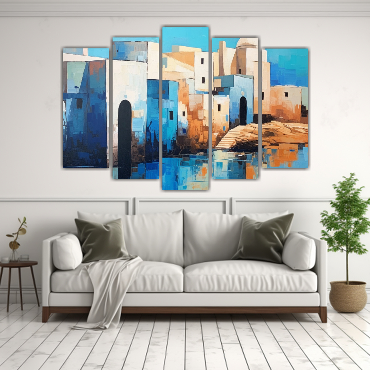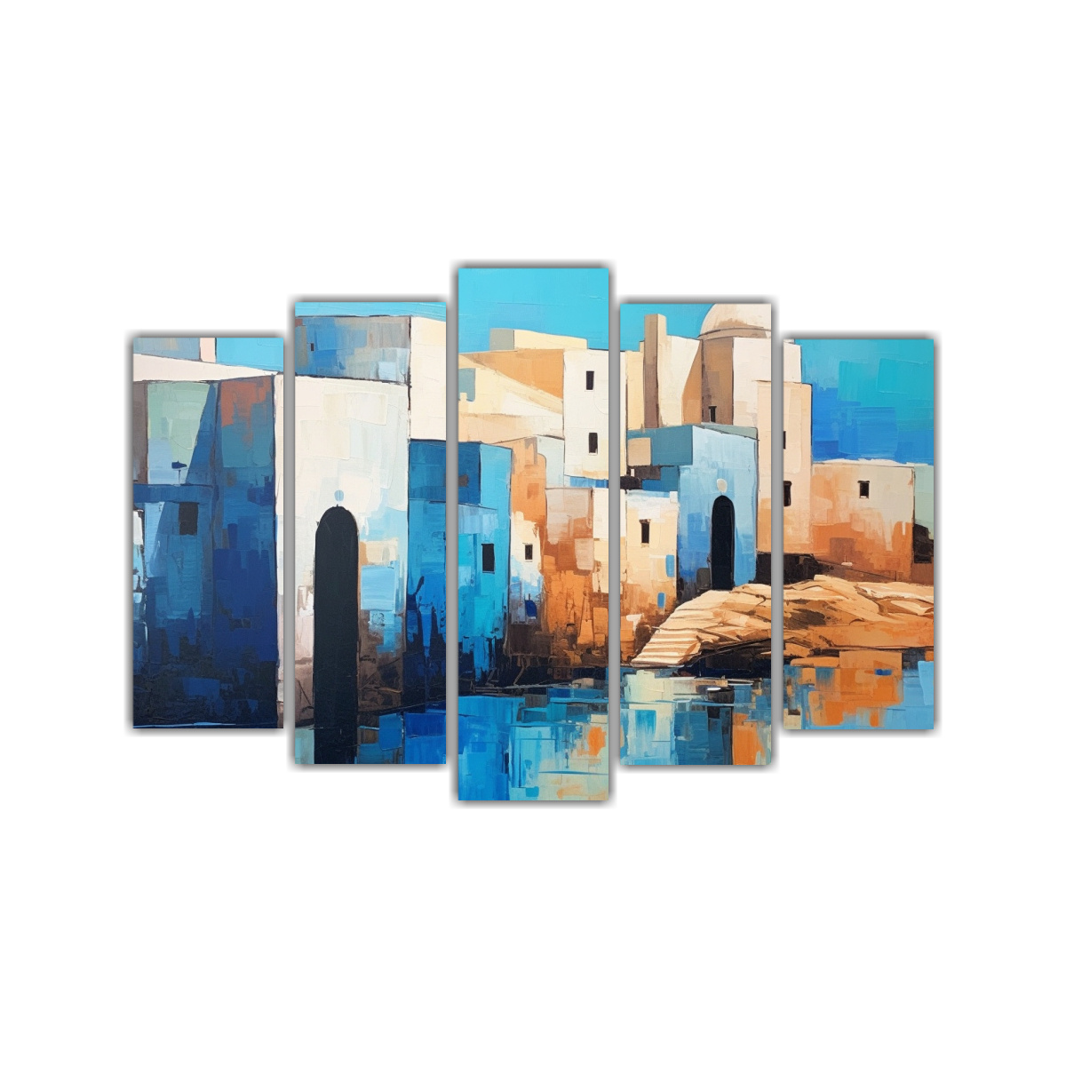 Este cuadro abstracto estilo Art Deco en cinco piezas brillantes sería ideal para decorar tu sala de estar Colócalo sobre un sofá blanco para crear un contraste moderno y elegante Añade cojines en tonos turquesa, coral y gris para completar la armonía del espacio