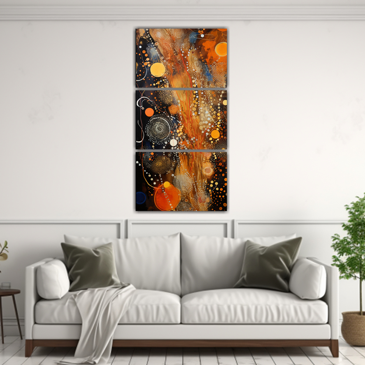 Dale un toque único a tus ambientes con este cuadro abstracto inspirado en el arte aborigen La intensa composición de patrones en tres cuadros le brindará personalidad y estilo a tu hogar En DecoCuadros encontrarás diseños exclusivos con la mejor calidad y los precios más baratos del mercado Aprovecha nuestras entregas rápidas y gratis en Santiago y envíos express a regiones