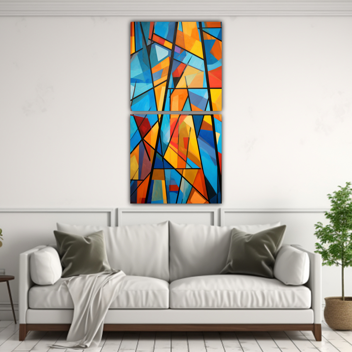 DecoCuadros te ofrece una increíble pintura abstracta inspirada en el movimiento cubista en tonos de azul marino grisáceo, verde azulado, coral, turquesa, dorado, carmesí y plateado Nuestros cuadros decorativos impresos en tela de alta calidad con bastidores de madera son perfectos para darle un toque vanguardista a tus espacios