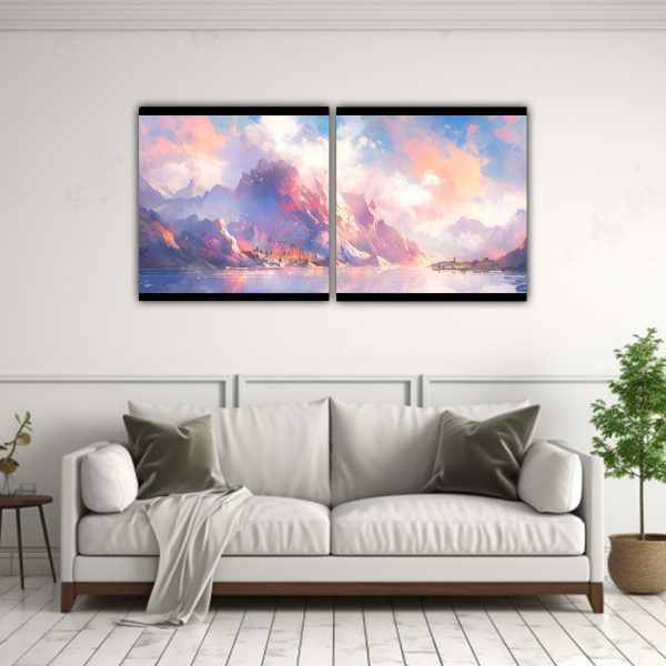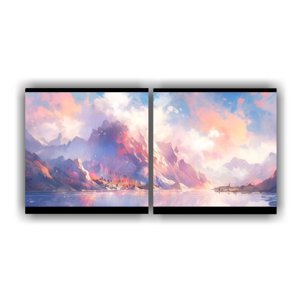 Decora tus espacios con esta composición de lagos y montañas en colores pastel Complementa tu ambiente con esta pieza única que brinda armonía y frescura Envíos express a regiones ¡Compra ahora y disfruta de la mejor calidad!