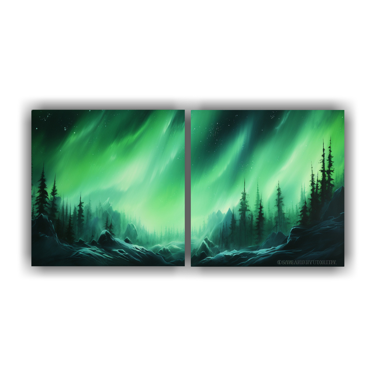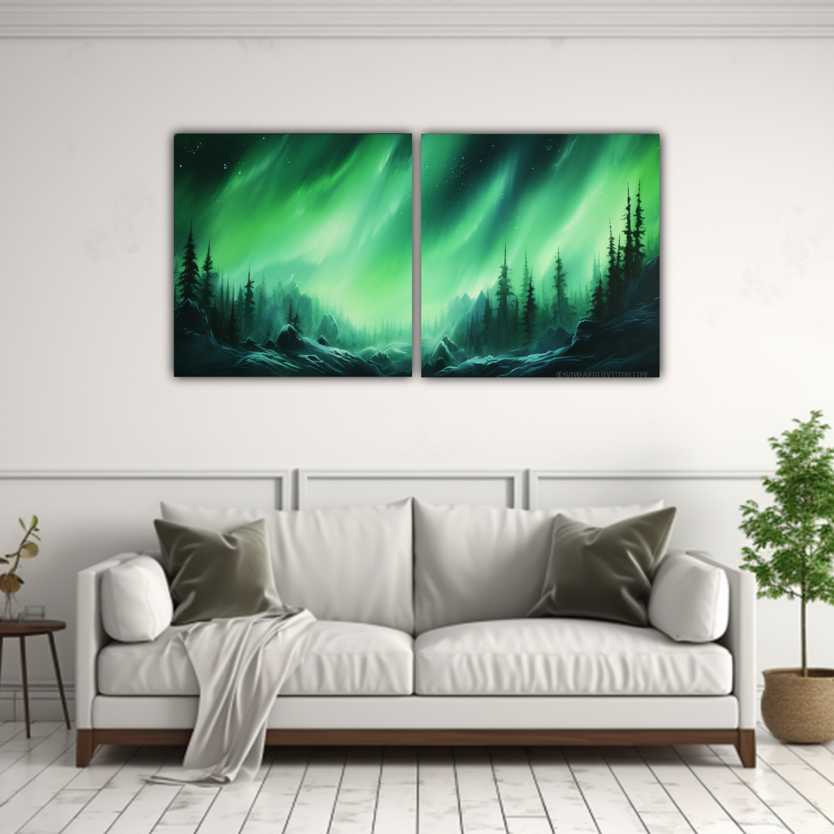 Este cuadro de auroras boreales verdes es perfecto para darle un toque de frescura y tranquilidad a tu sala de estar Colócalo sobre un sofá en tonos neutros para resaltar su belleza y crear un ambiente relajante ¡El complemento ideal para una decoración moderna y elegante!