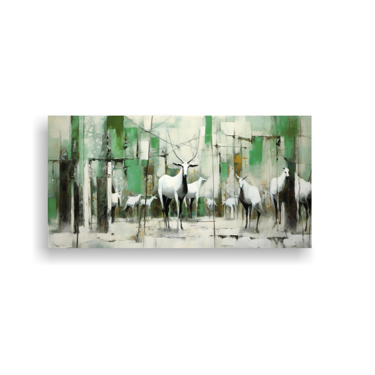 La pintura abstracta luminosa en blanco con detalles en verde es perfecta para añadir un toque moderno y elegante a cualquier espacio Destaca con colores como azul marino grisáceo, gris y menta, creando una armonía única