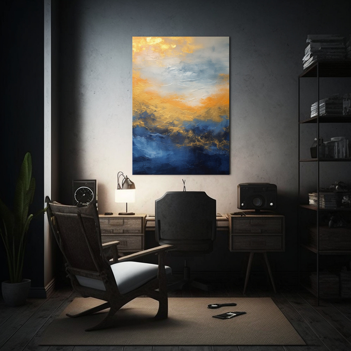 Este cuadro abstracto minimalista al amanecer con patrón intenso se verá espectacular en tu sala de estar Combínalo con muebles de tonos neutros como gris y chocolate para resaltar los tonos dorados y azules del cuadro También puedes colocarlo en la entrada de tu hogar para darle la bienvenida a tus invitados con estilo ¡Atrévete a añadir un toque de arte contemporáneo a tu decoración!