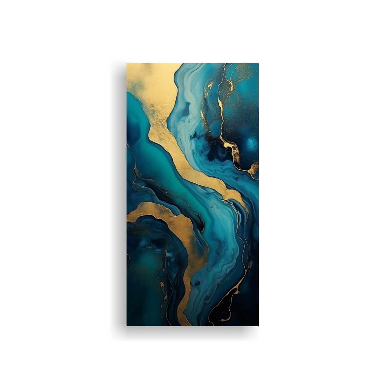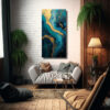 El cuadro abstracto moderno con azules, dorados y remolinos negros es perfecto para darle un toque de color y sofisticación a cualquier espacio Con colores como coral, azul marino grisáceo, turquesa, verde azulado, menta, dorado, plateado y chocolate, este cuadro se convertirá en el centro de atención de tu decoración