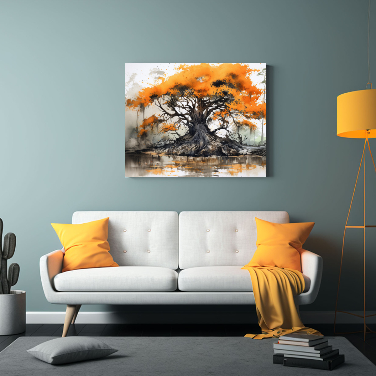 Este cuadro abstracto de un árbol de ciprés en colores naranja y negro sería ideal para decorar tu sala de estar o estudio, creando un ambiente moderno y sofisticado Colócalo sobre un mueble blanco para resaltar sus colores o en una pared gris para un contraste elegante