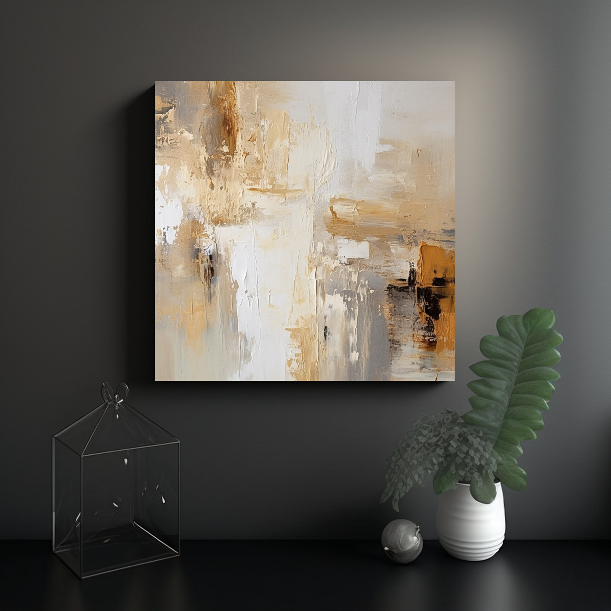 Pintura Abstracta Moderna En Tonos Beige Blanco Crema Y Dorado