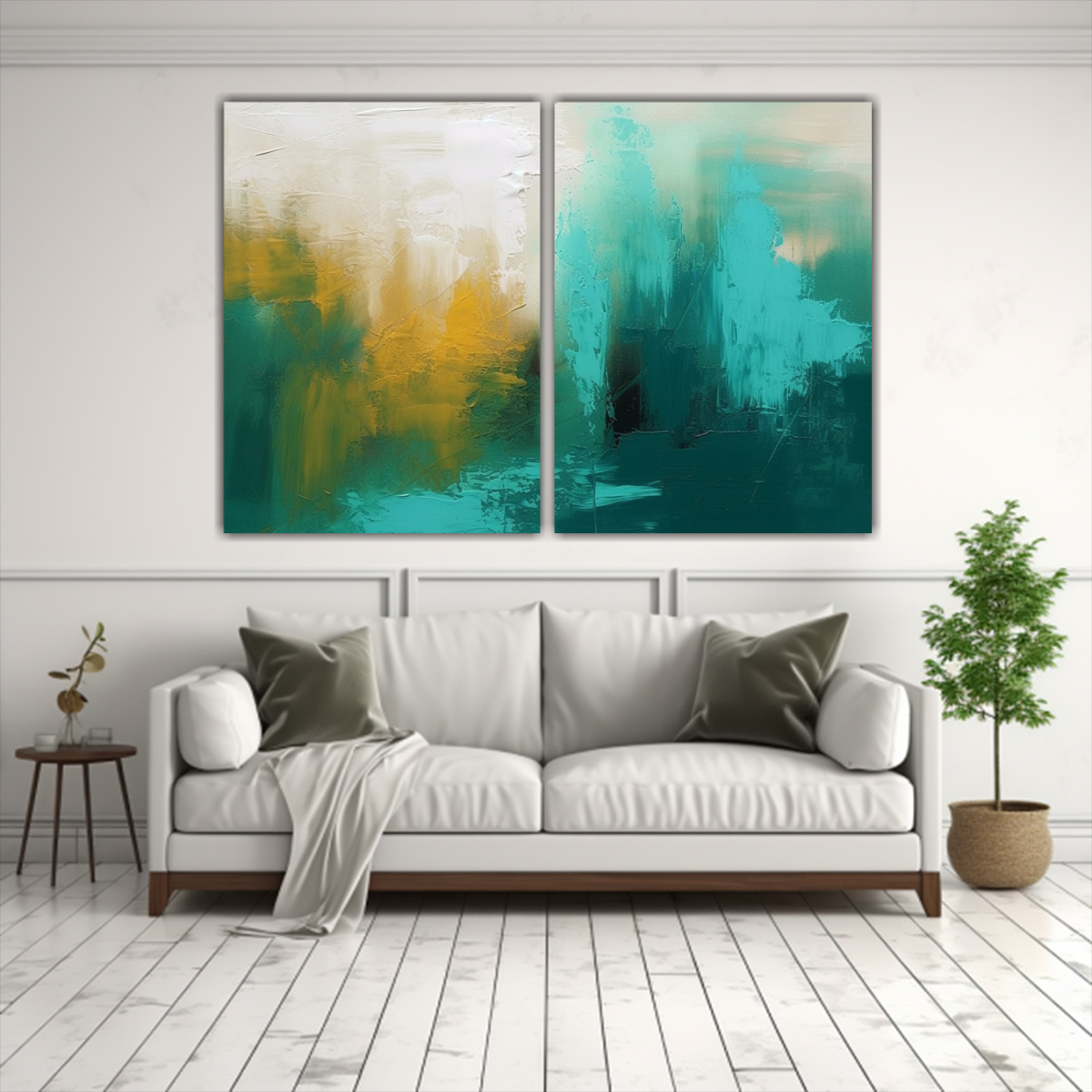 Pintura Abstracta Moderna En Verde, Turquesa, Gris Y Blanco.