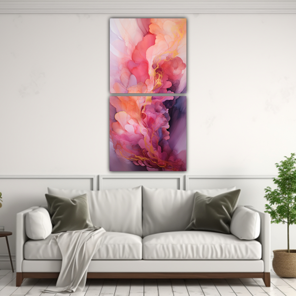 El cuadro abstracto morado, naranja y dorado – Set 2 es perfecto para añadir un toque de color y estilo a tus paredes Su combinación de tonos morados, naranjas y dorados crea una imagen vibrante y moderna que se adapta a cualquier ambiente