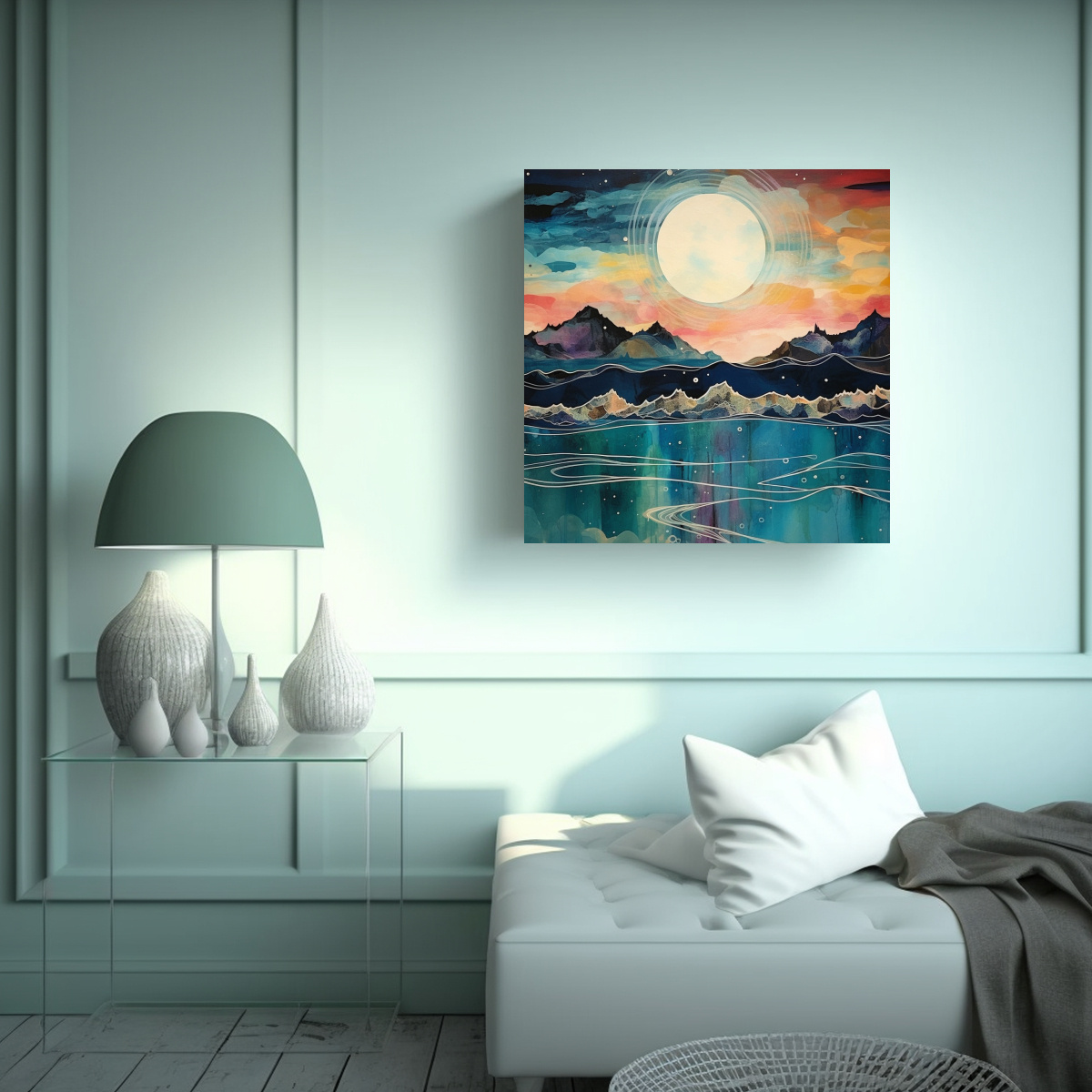 Este cuadro abstracto movimiento, mar, cielo, tierra, montañas es perfecto para decorar tu sala de estar o tu dormitorio Sus colores plateado, azul marino grisaceo, gris, negro, menta, coral, verde azulado, carmesí y turquesa le darán vida a cualquier ambiente Puedes colocarlo sobre un sofá o una cama, creando un punto focal en la habitación Además, combina muy bien con muebles blancos o de madera clara Atrévete a darle un toque moderno y sofisticado a tu espacio con este cuadro de diseño exclusivo