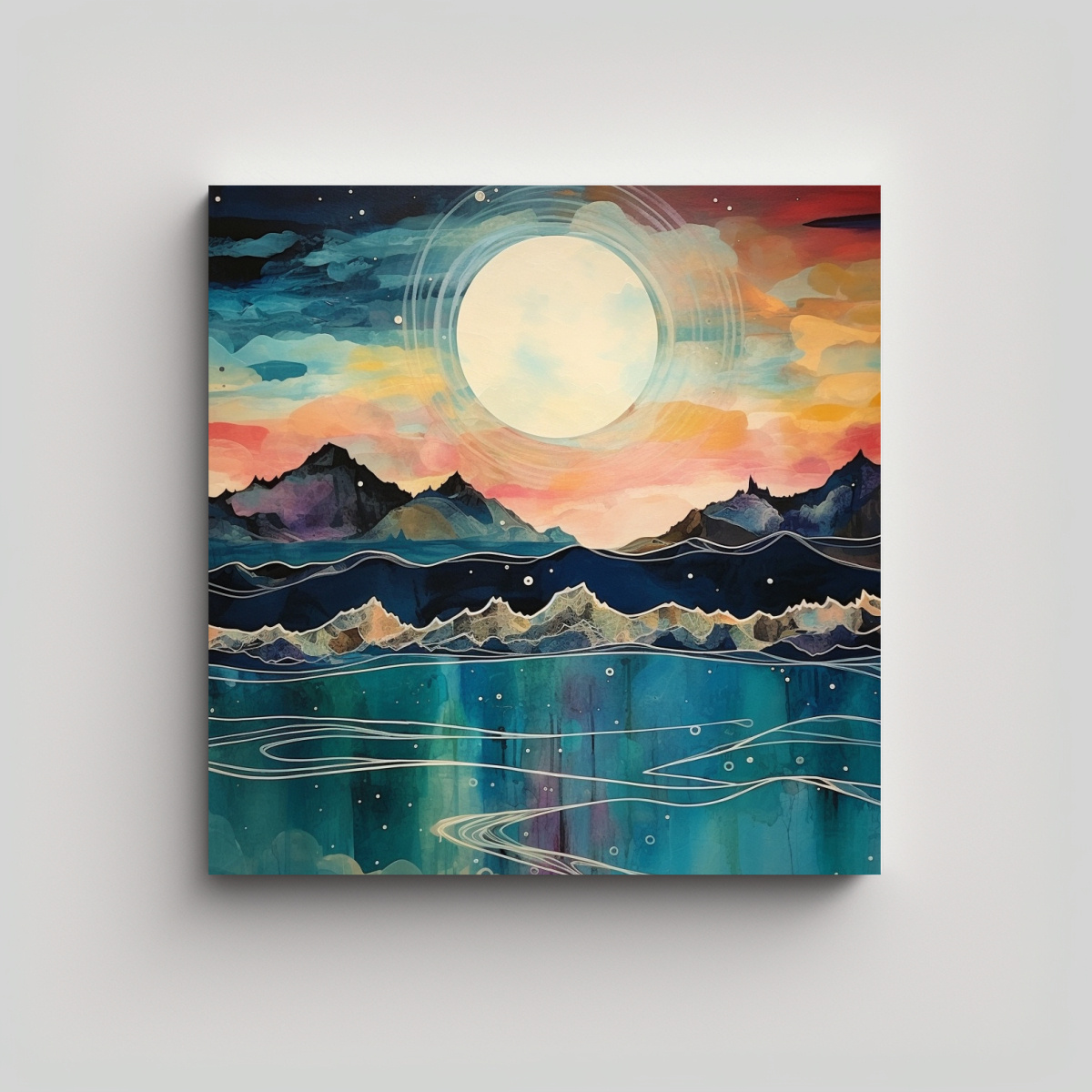 DecoCuadros te ofrece la pintura abstracta movimiento esquema mar cielo tierra montañas con colores plateado, azul marino grisaceo, gris, negro, menta, coral, verde azulado, carmesí y turquesa Nuestros cuadros están impresos en tela de alta calidad con bastidores de madera, lo que garantiza la mejor calidad del mercado Además, contamos con precios económicos, entregas rápidas y gratuitas en Santiago y envíos express a regiones No pierdas la oportunidad de decorar tus espacios con estilo y originalidad gracias a nuestros diseños exclusivos