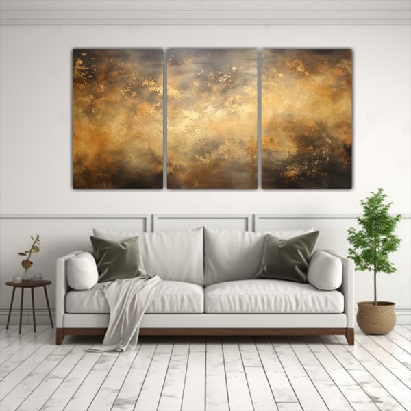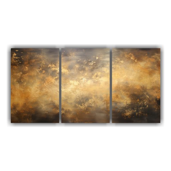 Pintura Abstracta Nocturna En Bastidor Con Tres Telas: Noche Estrellada Con Colores Dorados.