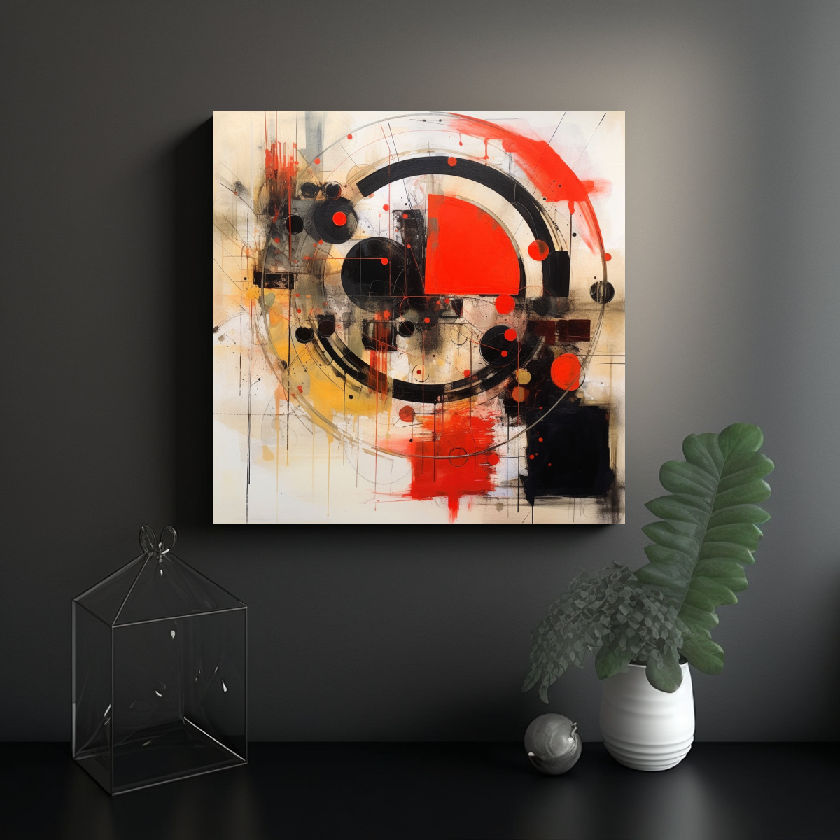 Dale un toque moderno a tu espacio con esta obra de arte en negro y rojo Colores carmesí, plateado, azul marino grisáceo, gris, coral y beige se combinan en una pieza única ¡No te pierdas esta oportunidad!