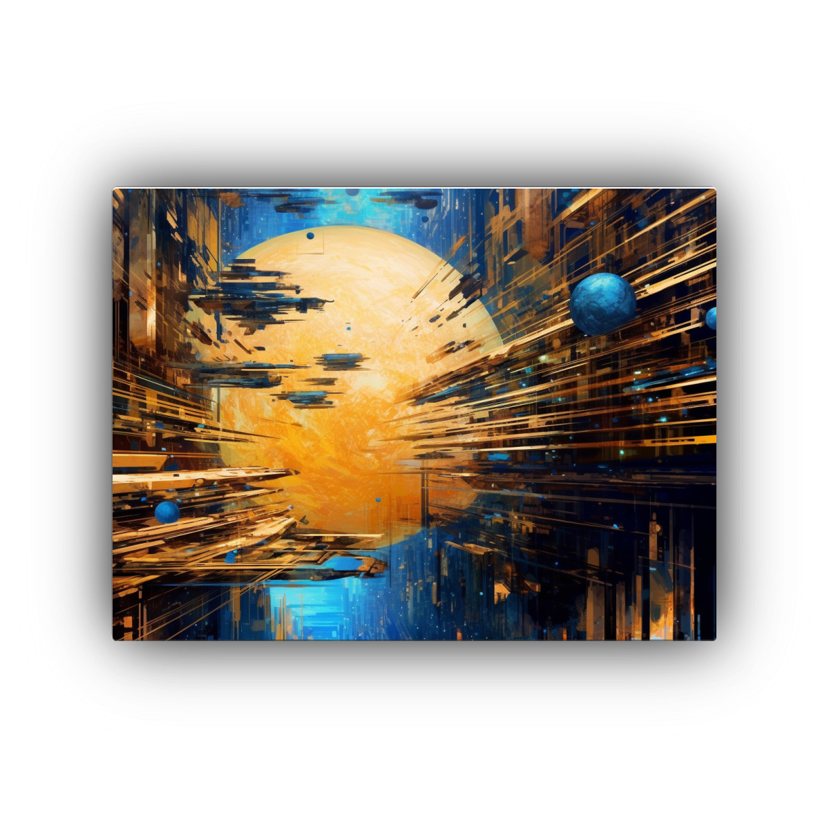 Este cuadro abstracto en oro y azul es ideal para decorar salas de estar o dormitorios, creando un punto focal de elegancia y modernidad Combínalo con muebles en tonos neutros o madera para resaltar su belleza y brillo