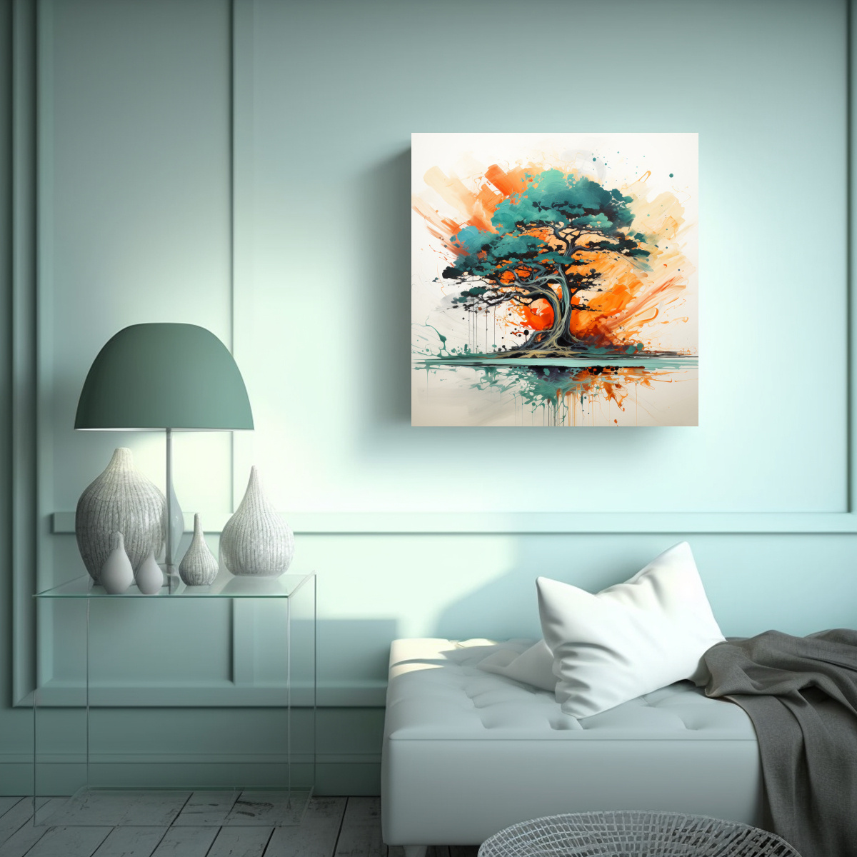 Este cuadro sería perfecto para colocar en una sala de estar o en un espacio de trabajo Sus colores turquesa y naranja le darán vida y energía al ambiente Puedes combinarlo con muebles en tonos neutros como beige o gris, y agregar algunos accesorios en color coral para crear un contraste armonioso También puedes colgarlo en una pared blanca para que sea el centro de atención ¡Lleva a tu hogar este cuadro único y crea un ambiente lleno de estilo!