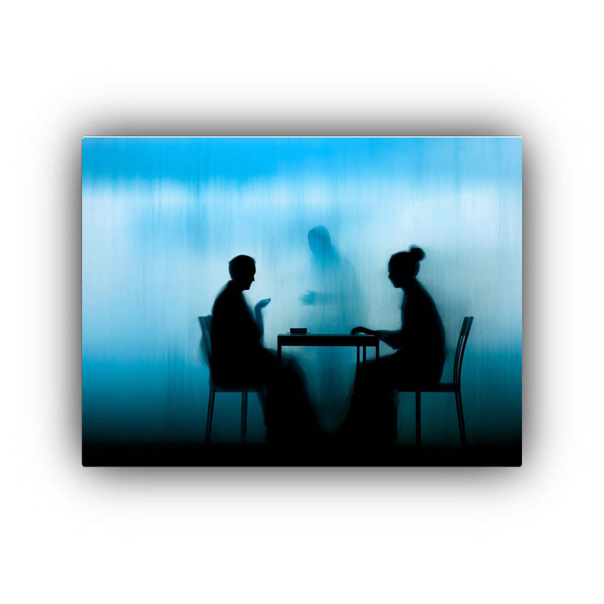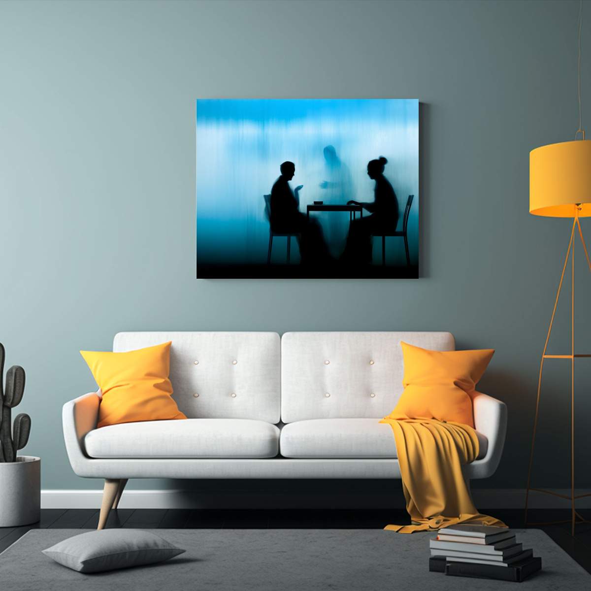 Pintura Abstracta: Tres Personas Sentadas En Mesa, Una Mira