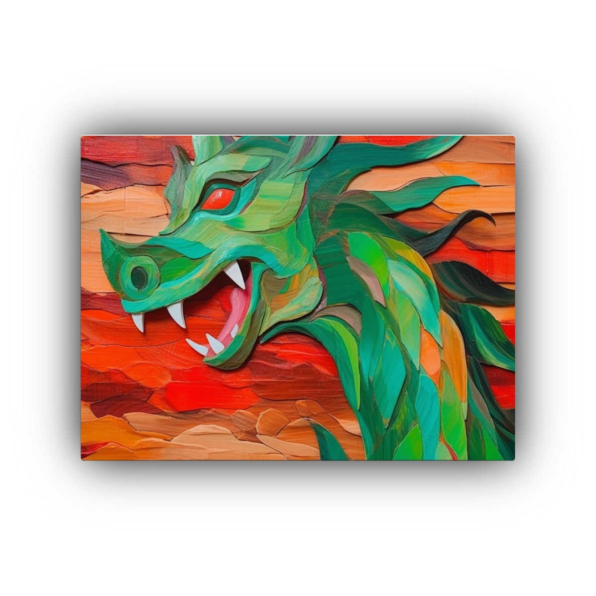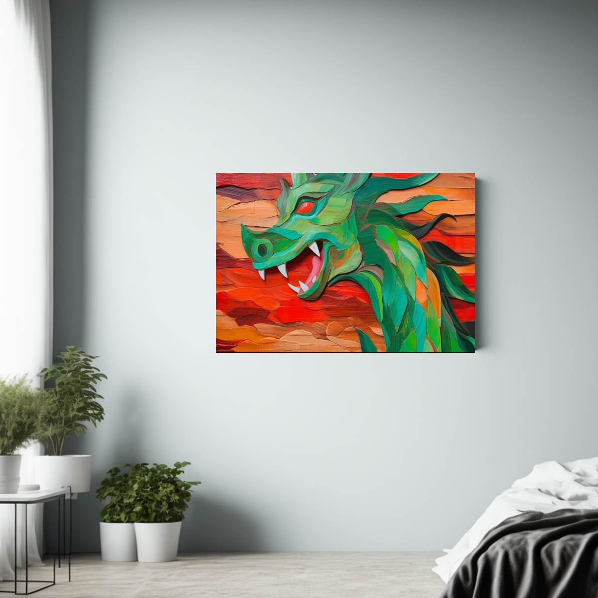 Pintura Abstracta Vibrante De Dragón Verde En Rojo Brillante