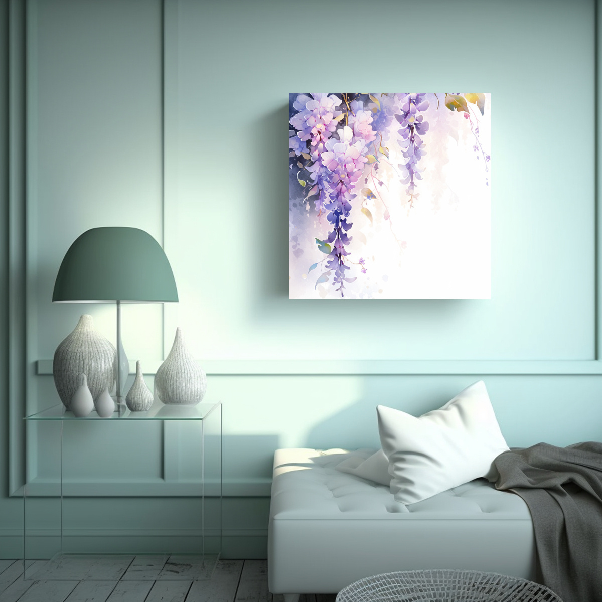 Este cuadro de pintura acuarela abstracta inspirada en una habitación con wisteria es perfecto para decorar tu sala de estar o dormitorio Combínalo con muebles en tonos neutros como blanco, gris o beige para crear un ambiente relajante y elegante También puedes colocarlo en un pasillo o recibidor para darle vida y color a esos espacios más pequeños ¡Deja volar tu imaginación y crea un ambiente único con este cuadro exclusivo de DecoCuadros!