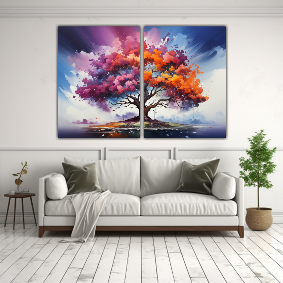 Añade un toque de color y elegancia a tu espacio con esta pintura acuarela de árbol acacia en colores plateado, azul marino grisaceo, carmesí, coral, lila, menta y turquesa Calidad y exclusividad a precios accesibles