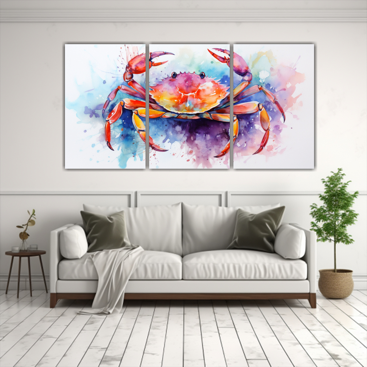 Descubre la representación impresa de un cangrejo en estilo acuarela con tonos de Carmesí, Lila y Turquesa Cuadro exclusivo de DecoCuadros, ideal para añadir un toque de frescura y color a tu sala de estar o cocina