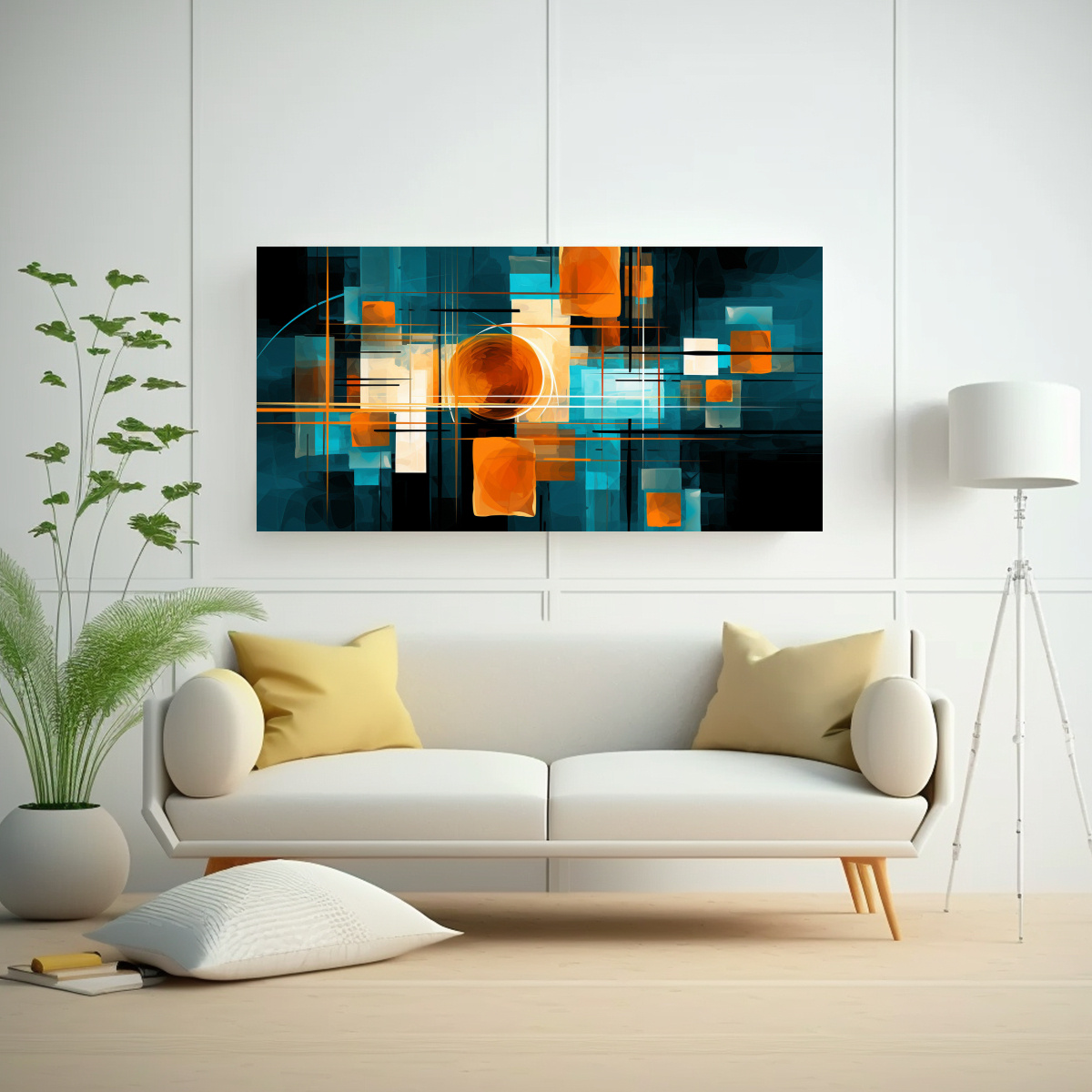 Encuentra en nuestra tienda DecoCuadros la pintura acuarela de ambiente azul y naranja en estilo abstracto con tonos mostaza, negro, beige, turquesa, verde azulado, azul marino grisaceo, plateado y chocolate Nuestros cuadros decorativos impresos en tela de alta calidad con bastidores de madera te ofrecen diseños exclusivos, la mejor calidad y precios económicos Entrega rápida y gratuita en Santiago, además de envíos express a regiones