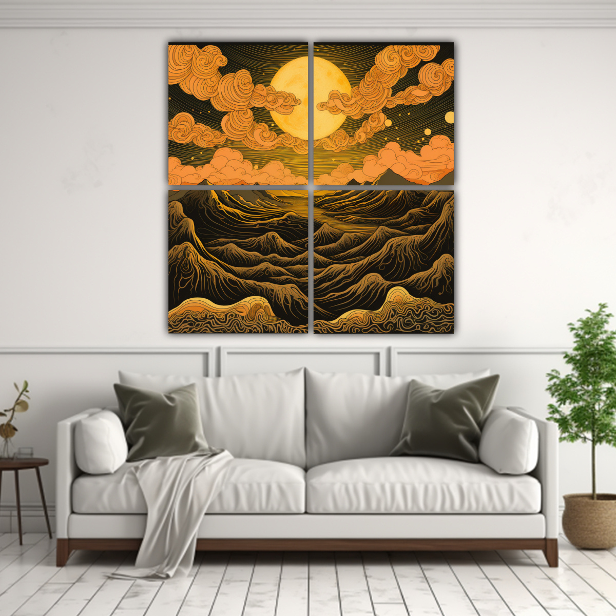 Este cuadro Acuarela Montañas y Sol de Cuatro Artes quedará perfecto en el salón de tu casa, sobre un sofá en tonos neutros Su vibrante paleta de colores complementará el ambiente, creando una sensación de calma y serenidad También puedes colocarlo en tu dormitorio, donde sus tonos cálidos te ayudarán a relajarte y descansar ¡Atrévete a decorar tus espacios con este cuadro y disfruta de su belleza única!