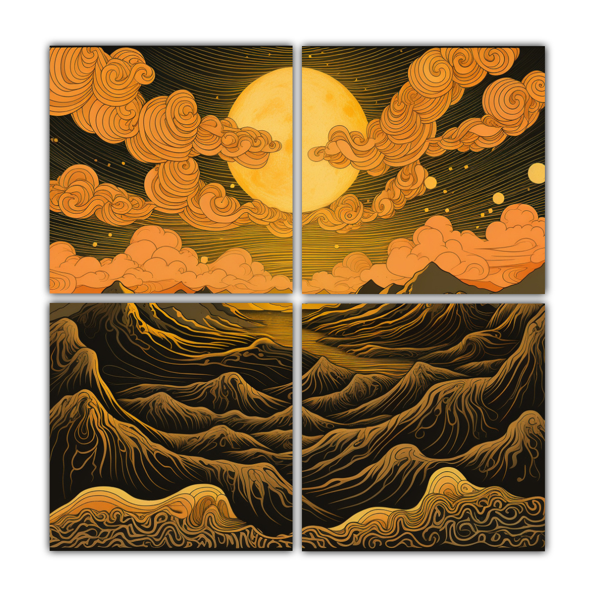 Pintura Acuarela De Montañas Y Sol En Cuatro Artes
