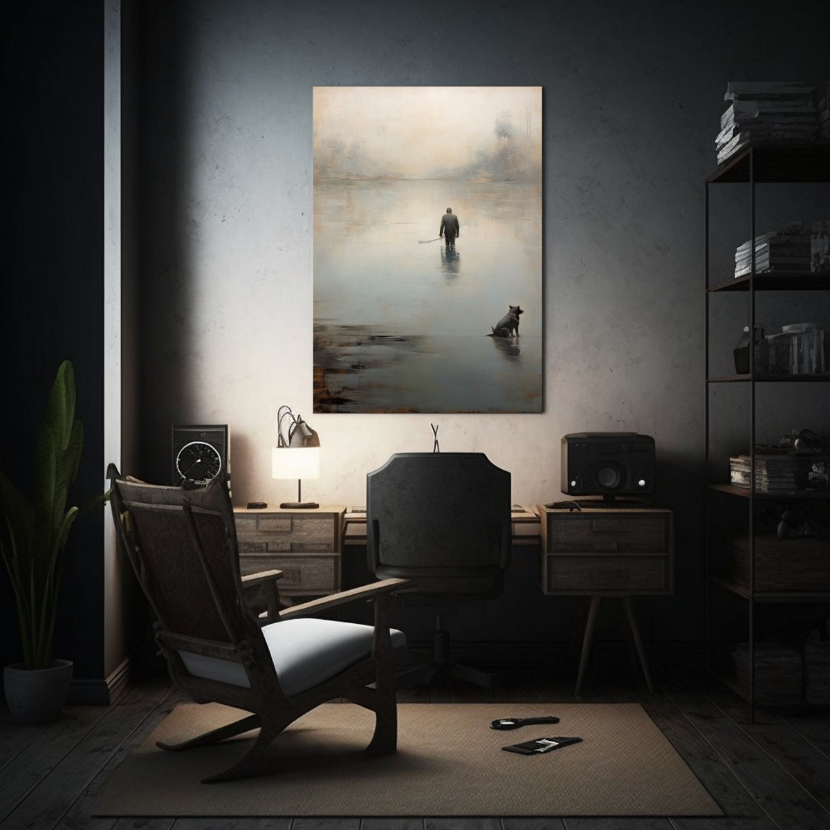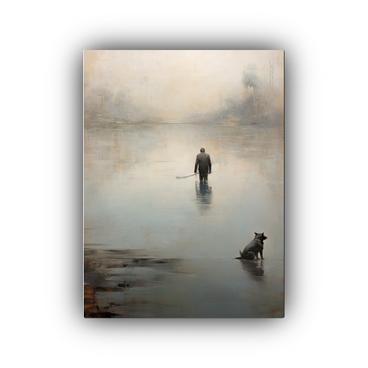 Decora tu hogar con el cuadro acuarela elegante de un hombre y su perro en el agua Los colores plateado, azul marino grisaceo, gris y beige le darán un toque de sofisticación a tu espacio En DecoCuadros ofrecemos la mejor calidad del mercado a precios económicos Envío gratis en Santiago y envíos express a regiones