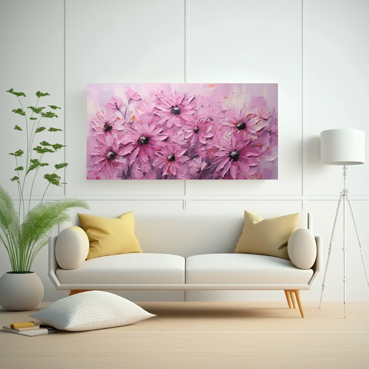 Este cuadro de girasol rosa en lienzo se vería espectacular en tu sala de estar, combínalo con muebles en tonos beige y gris para crear un ambiente armonioso y acogedor ¡Atrévete a darle vida a tus paredes con DecoCuadros!
