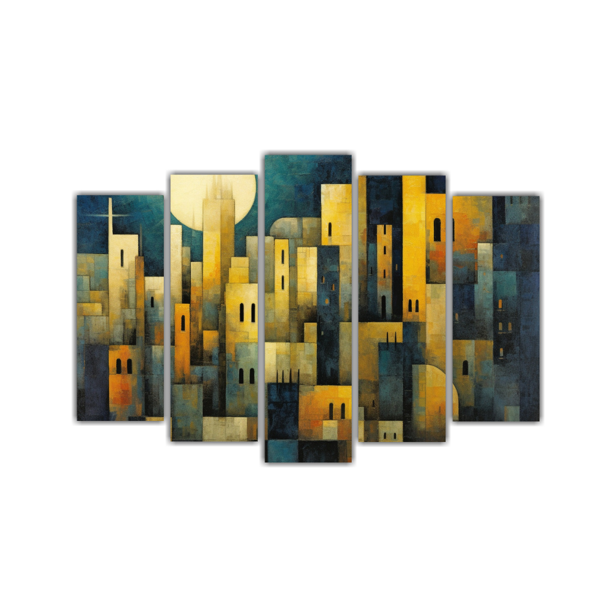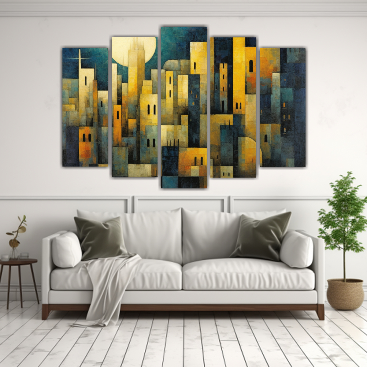 Este cuadro de la luna azul con edificios en la calle se vería espectacular en el dormitorio, creando un ambiente tranquilo y misterioso Combínalo con tonos dorados, grises y amarillos en la decoración para resaltar su belleza y agregar un toque de elegancia a tu espacio