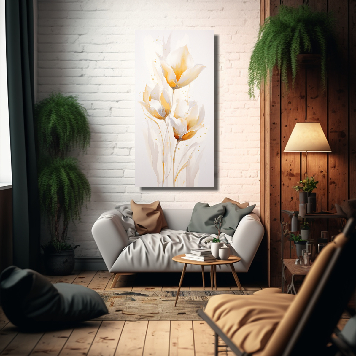 Este cuadro de tulipanes acuarela moderna en colores blanco y dorado es ideal para decorar tu sala de estar Colócalo sobre el sofá principal para crear un punto focal en la habitación Combina este cuadro con cojines en tonos neutros como beige o gris, y agrega una alfombra en tonos cálidos para completar la decoración El resultado será un ambiente elegante y acogedor, donde los tulipanes serán los protagonistas de la decoración